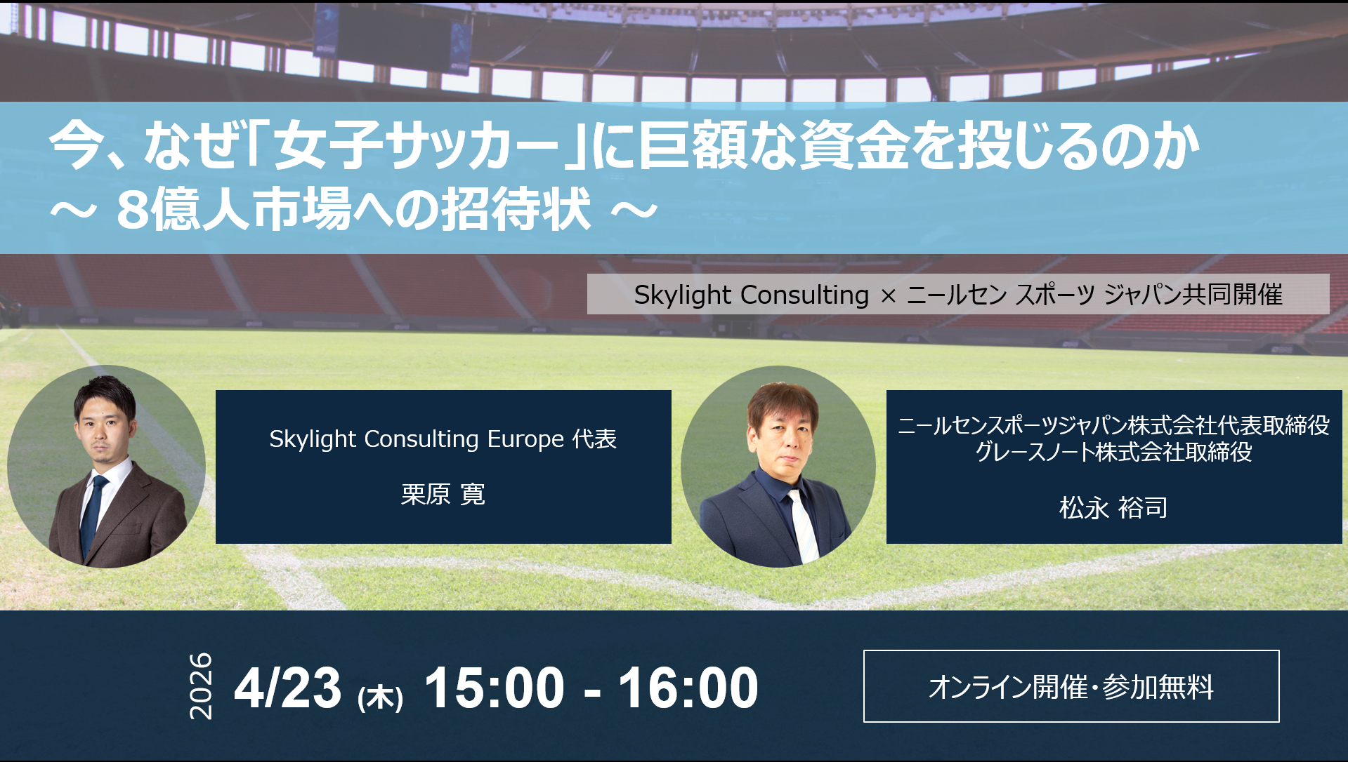 ニールセン スポーツ ジャパン株式会社(所在地:東京都港区赤坂、代表取締役:松永裕司、設立:2007年12月)は2026年4月8日、スカイライトコンサルティング株式会社(所在地:東京都港区赤坂、代表取締役:羽物俊樹、設立:2000年3月)との合同ウェビナーを同月23日(木)15時から実施すると発表した。