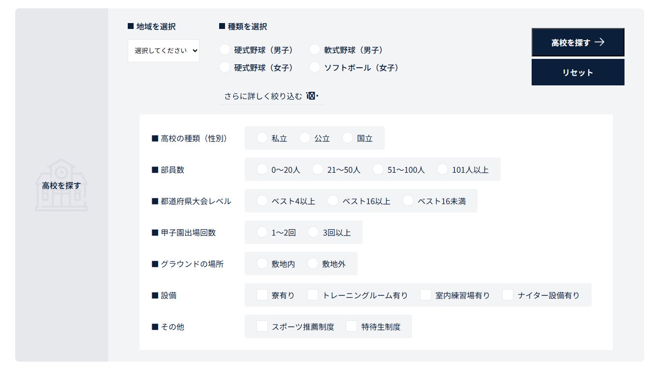 昨年9月の中学球児の登録不要から半年で、登録校数は2.4倍(78校)へと急拡大。今回のリニューアルにより、中学球児や保護者は男女をはじめ、硬式・軟式・ソフトボールなど、より詳細な条件で検索が可能になり、高校野球部関係者は登録方法の簡素化により、事前に写真や動画をご用意いただければ「パソコン・スマホから約15分」で自校の野球部の魅力を登録できるようになりました。