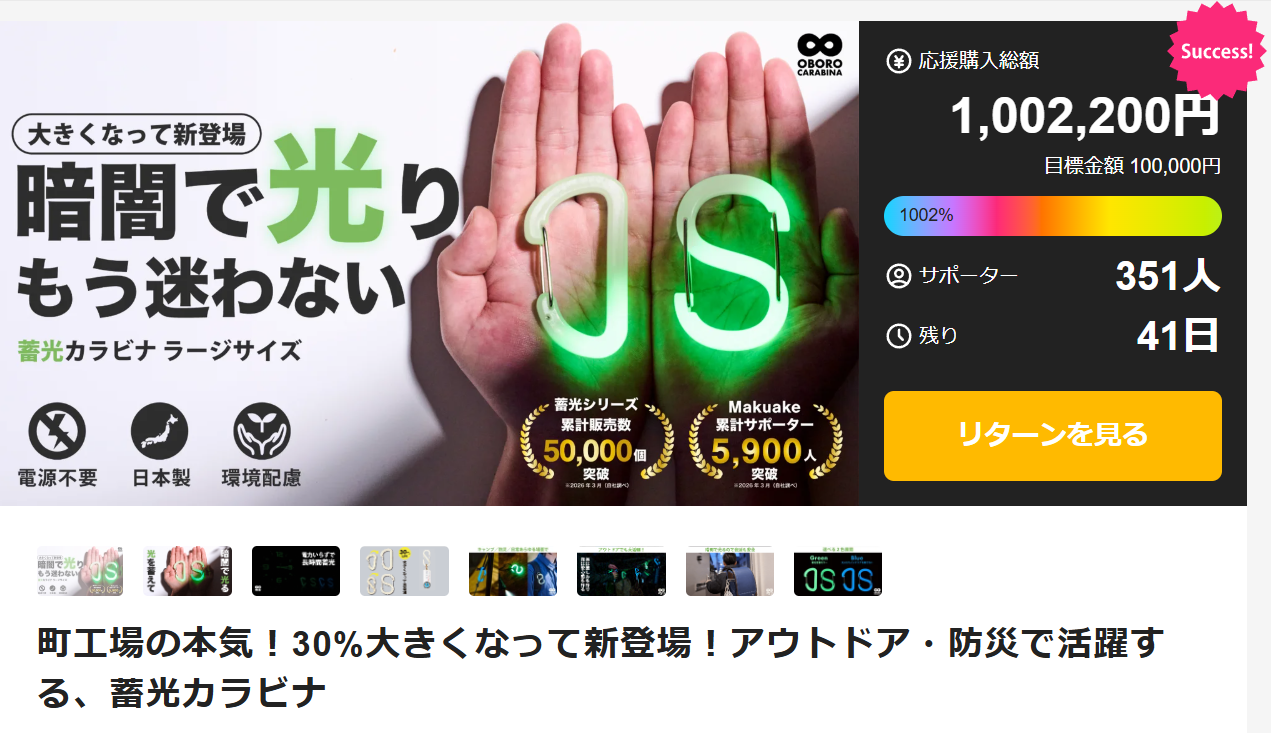 株式会社丸八化成(愛知県)がMakuakeで展開中の第7弾プロジェクト「蓄光カラビナ ラージサイズ」は、開始33時間で応援購入総額100万円を達成し351人のサポーターに応援されました!創業50年の町工場が挑む自社ブランド展開と、防災性を備えた実用プロダクトが共感を集めています。