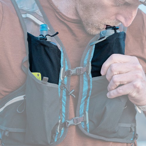 500mlのソフトフラスクとペットボトルが収納可能。落下防止のドローコード付き