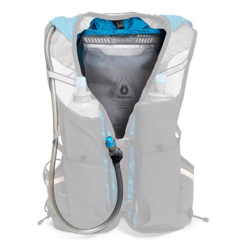 ハイドレーションパックは、背中との接地面の専用ポケットに収納可能。サスペンションシステムにより、水量が減っても身体と密着した圧縮状態が保たれ、走行中の水の揺れによる走行リズムの乱れを抑えます。ハイドレーションホースは左右の肩どちらからでも通すことができます。