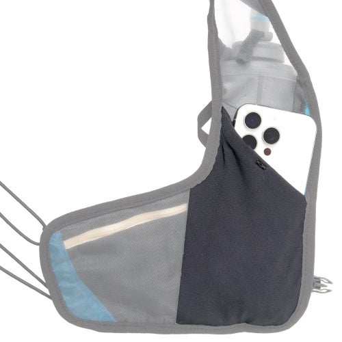 500mlのソフトフラスクとペットボトルが収納可能。落下防止のドローコード付き