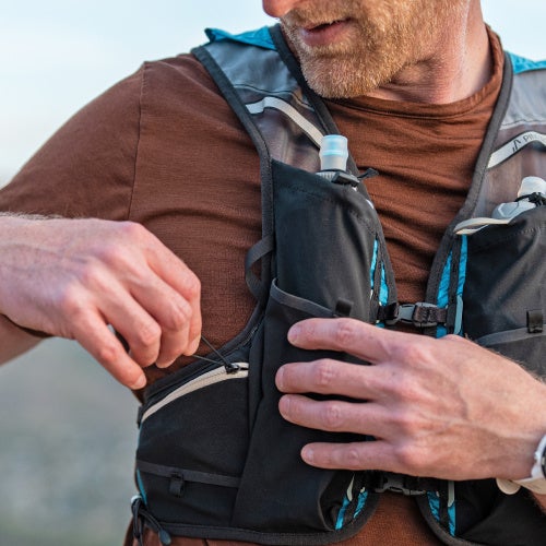 アクセス性の高い本体前面に複数のポケットを装備。補給食やスマートフォンやライト、ホイッスル、ソフトフラスクなど、必要なアイテムに素早くアクセスできます。パフォーマンス精度を高めるために極限まで無駄をそぎ落とし、より軽快な携行を実現しました。