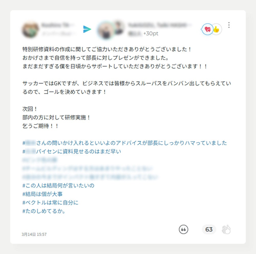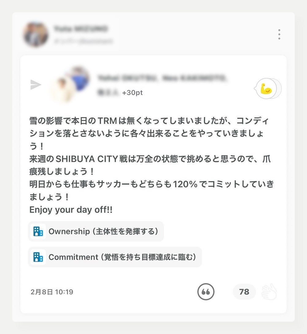 メンバーは、多様な業務における助け合いはもちろん、ピッチ上での献身的なプレーに対してもリアルタイムで感謝や称賛を送り合っています。ビジネスとスポーツ、異なる環境下であっても互いの「貢献」や「ねぎらい」を可視化する仕組みが、チームの結束力向上や主体的な行動の促進につながっています。