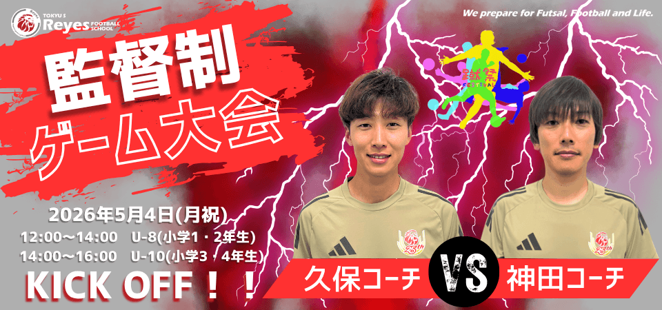 東急Sレイエス フットボールスクール 池袋では、久保コーチと神田コーチがコーチのプライドを掛けた真剣勝負として『監督制ゲーム大会』を開催いたします。