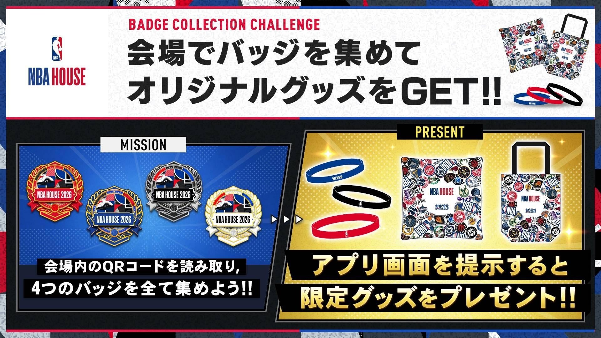 会場内の複数ブースに設置されたQRコードをアプリで読み取り、デジタルバッジを集めると限定グッズがもらえるプレゼント企画を実施します。デジタルバッジを全種類集め、NBA docomoブースに来訪しNBA docomoアプリ画面を提示すると限定特典グッズが進呈されます。