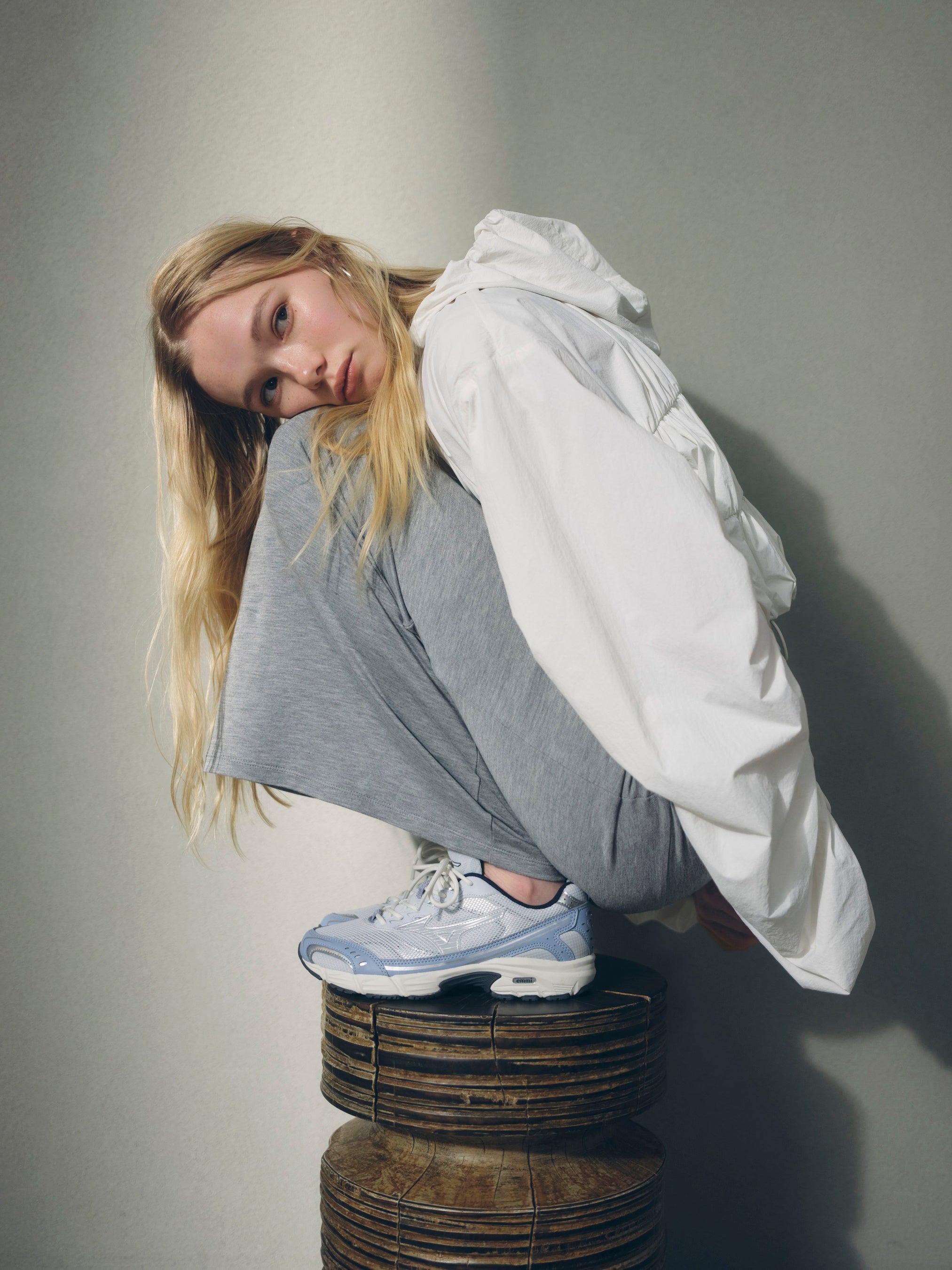 2000年代ランニングの代表的モデルである「MXR(エムエックスアール)」をベースに別注。「MXR」の特長であるアッパーの2層のメッシュ構造を生かす淡いブルーのワントーン、ネイビーやシルバーを加え、軽やかな中にも立体的な表情感をプラス。清涼感のあるカラー使いで、春の装いを軽やかに。インソール・ミッドソールにemmiロゴ入り。