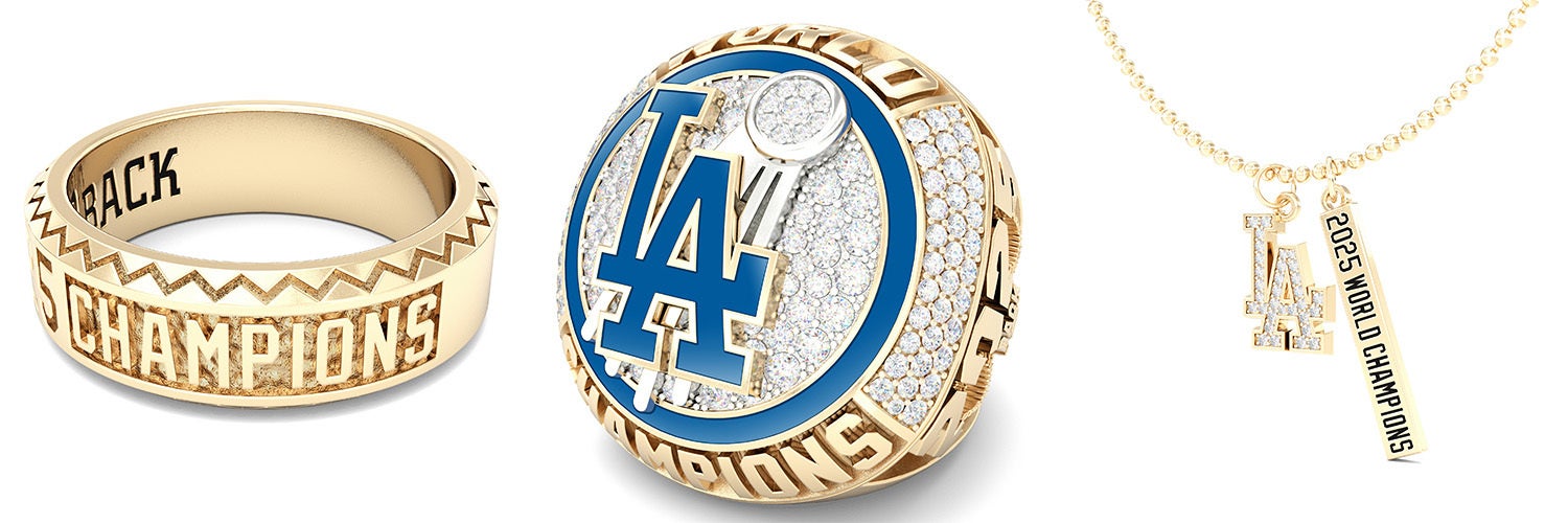 本コレクションに含まれるネーションリングは、ドジャースのホームゲーム第2戦、アリゾナ・ダイヤモンドバックス戦にて実施されたセレモニーで選手たちが着用し披露されましたチャンピオンシップリングを、栄光と威厳をもって再現されたものです。さらには、バンドリングやチャームネックレスなど、