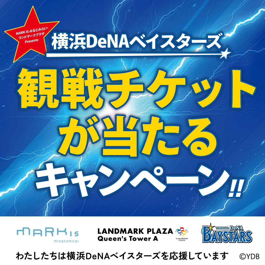 MARK IS みなとみらい、横浜ランドマークタワーのいずれかのLINE公式アカウントから配信される横浜DeNAベイスターズ関連クイズにご回答いただくと、抽選で横浜DeNAベイスターズホームゲーム観戦チケットをペアでプレゼントします。