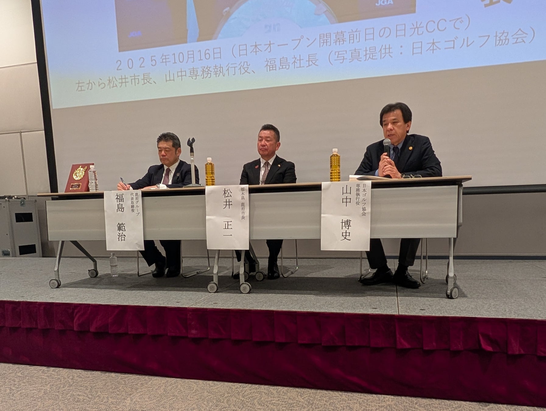 また表彰式後には、日本ゴルフジャーナリスト協会 会長 小川朗氏をファシリテーターに、松井正一鹿沼市長、山中博史日本ゴルフ協会専務執行役とともにパネルディスカッションが行われ、地域振興とゴルフ振興の連携や、コミュニティゴルフを通じた新たなゴルフの可能性について意見が交わされました。