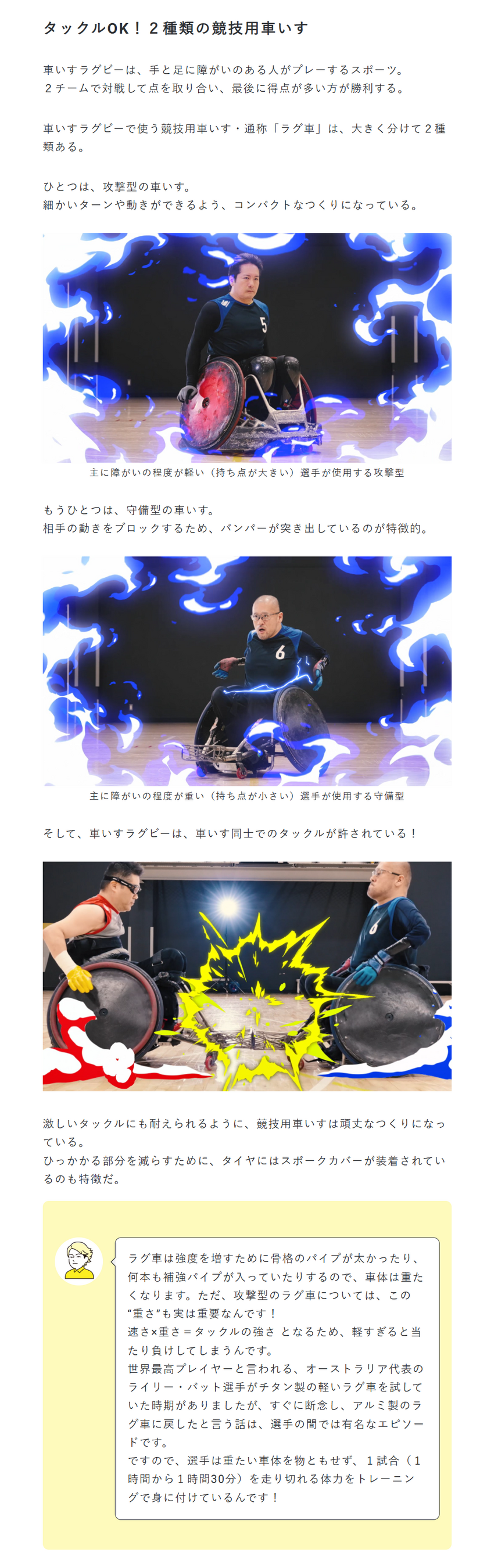 テレビドラマの放送を控え、今まさに注目が集まる車いすラグビー。本作では、現役選手による迫力満点の動画に加え、テレビドラマで選手の所作・競技シーンの監修も務めた峰島靖さんが競技の醍醐味をWEB記事で徹底解説。競技の醍醐味・奥深さを、初心者からファンまで楽しめる内容でお届けします。