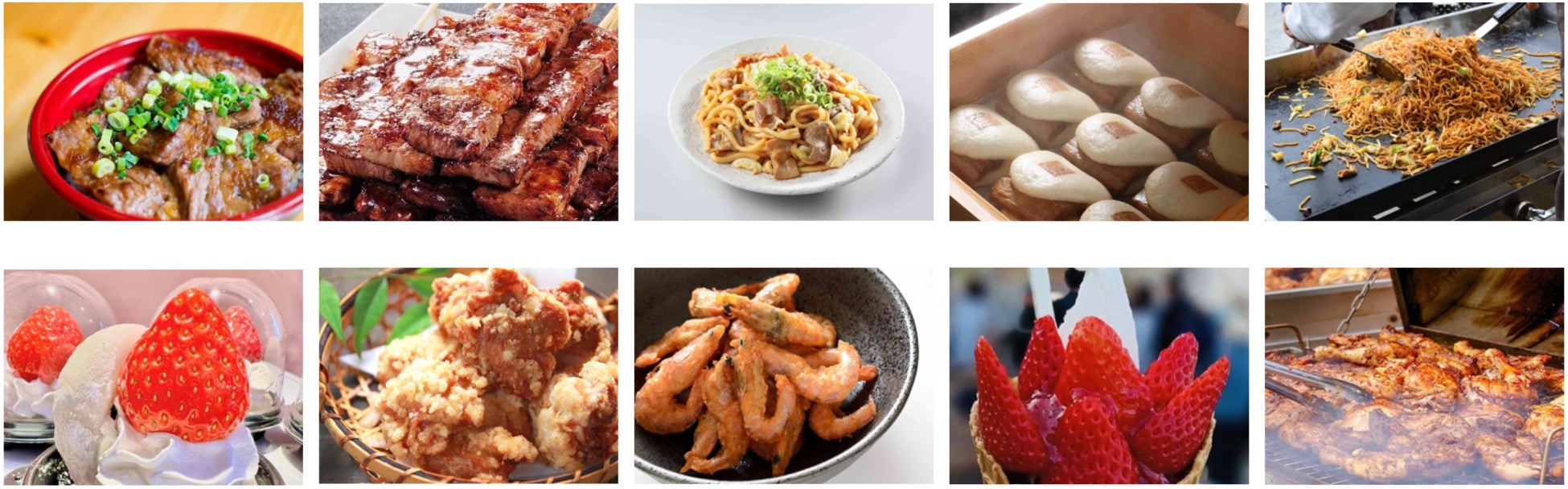 オートポリスのマスコット「ポリ坊」誕⽣を機に、「うまかもんストリート」が「ポリ坊まんぷく屋台村」としてリニューアル。お馴染みのおいしいお店に加えて、地元⼤分や熊本をはじめ九州各地から新店舗も続々登場。⾷のオートポリスを味わいつくそう!(写真は提供メニューの⼀部)