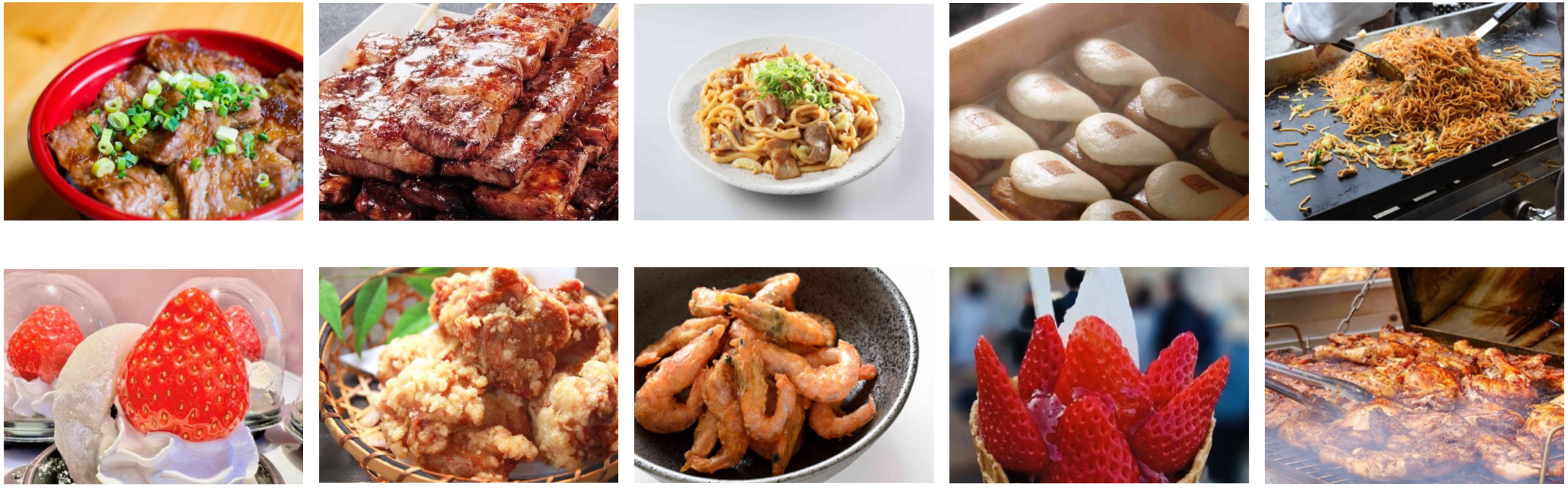オートポリスのマスコット「ポリ坊」誕⽣を機に、「うまかもんストリート」が「ポリ坊まんぷく屋台村」としてリニューアル。お馴染みのおいしいお店に加えて、地元⼤分や熊本をはじめ九州各地から新店舗も続々登場。⾷のオートポリスを味わいつくそう!(写真は提供メニューの⼀部)