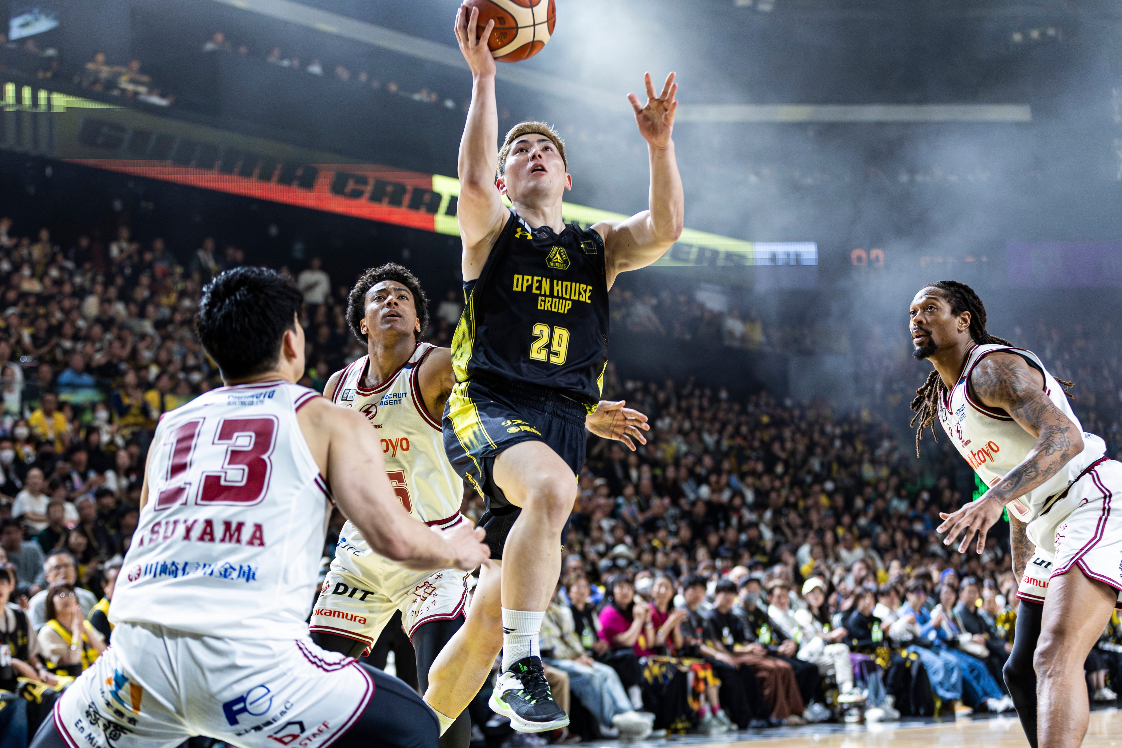 点差が開いたあの時間帯は、自分の出番があると思って準備していました。普段は外からのシュートが多いのですが、今日は相手がギャンブル気味に守っていたので、カッティングでゴール下へ行くチャンスを狙っていました。そこに運良くパスが来て得点に繋がりました。あのアリウープは狙っていましたし、祐眞さんなら必ず出してくれると信じていたので、実現できて本当に嬉しいです。