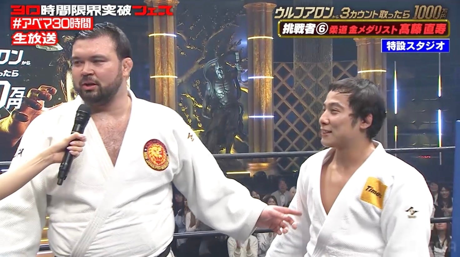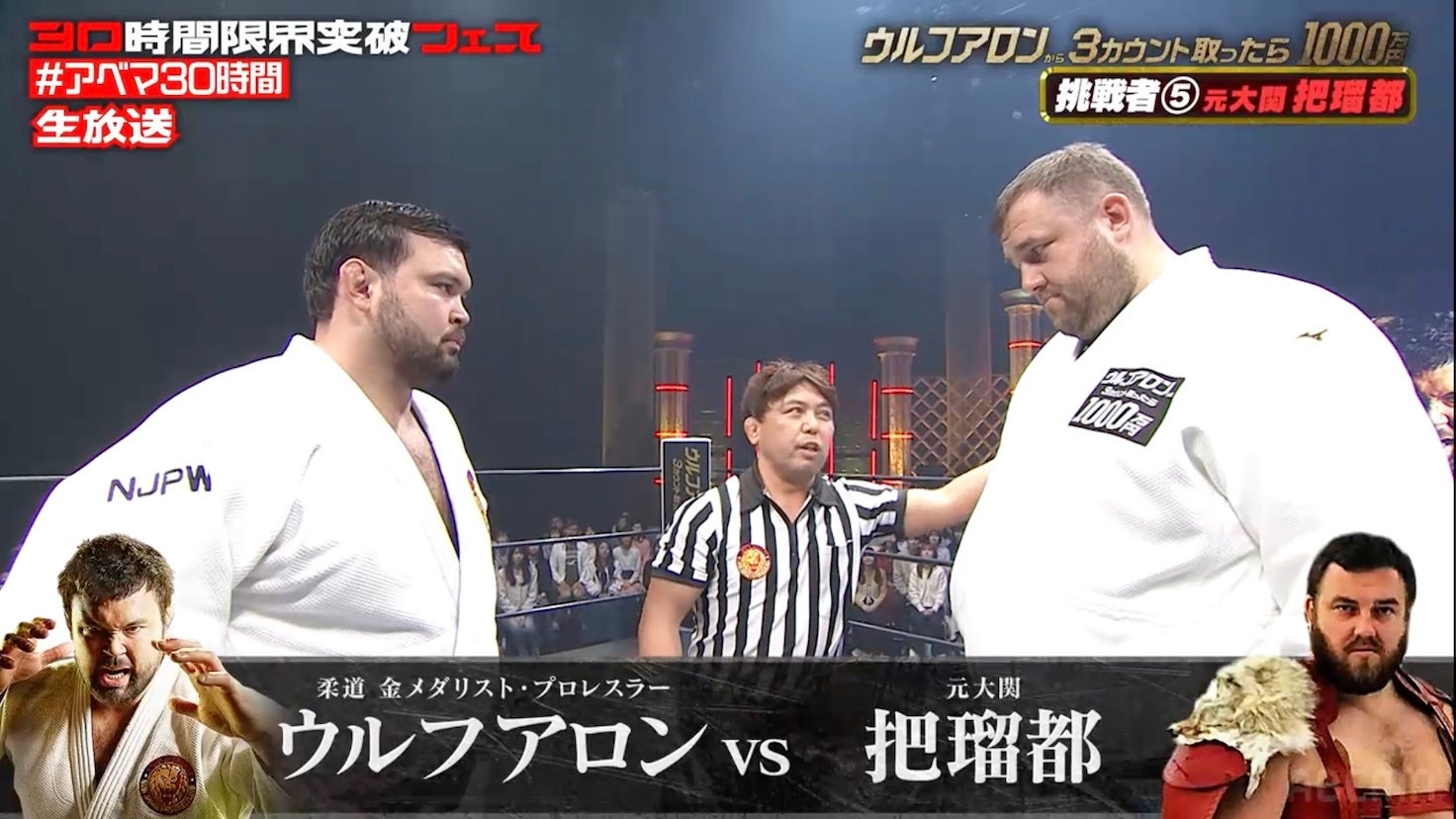 このたび、柔道選手からプロレスラーに転身したウルフアロンが参戦する『ウルフアロンから3カウント取ったら1000万円』を、『30時間限界突破フェス』の目玉企画として4月11日(土)の午後3時30分より第1部、そして夜9時より第2部を放送。2021年放送の『朝倉未来にストリートファイトで勝ったら1000万円』以来、5年ぶりとなる「1000万円シリーズ」。ルールは4分一本勝負とし、「マットに背中をつけて3カウントを奪う」または「投げ技で一本を取る」ことで勝利となります。なお、すべての打撃技、関節技、締め技および急所への攻撃、噛みつき行為は禁止となり、双方が柔道着を着用します。