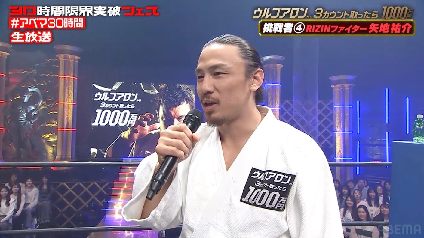 新しい未来のテレビ「ABEMA(アベマ)」は、2026年4月11日(土)に開局10周年を迎えました。この節目を記念した特別番組『30時間限界突破フェス』の目玉企画、『ウルフアロンから3カウント取ったら1000万円』の第2部にて、矢地祐介、把瑠都、髙藤直寿の3名がウルフアロンに挑みました。