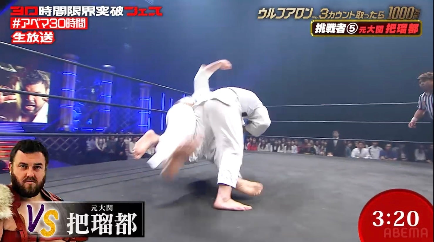 「ABEMA」開局10周年記念の特別番組『30時間限界突破フェス』の目玉企画『ウルフアロンから3カウント取ったら1000万円』は無料配信中!