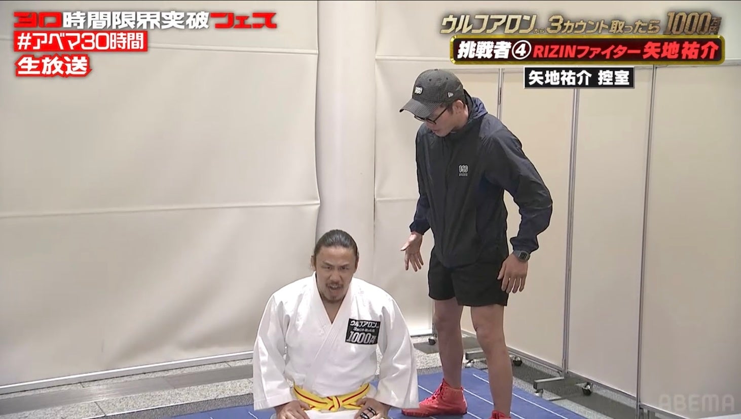 新しい未来のテレビ「ABEMA(アベマ)」は、2026年4月11日(土)に開局10周年を迎えました。この節目を記念した特別番組『30時間限界突破フェス』の目玉企画、『ウルフアロンから3カウント取ったら1000万円』の第2部にて、矢地祐介、把瑠都、髙藤直寿の3名がウルフアロンに挑みました。