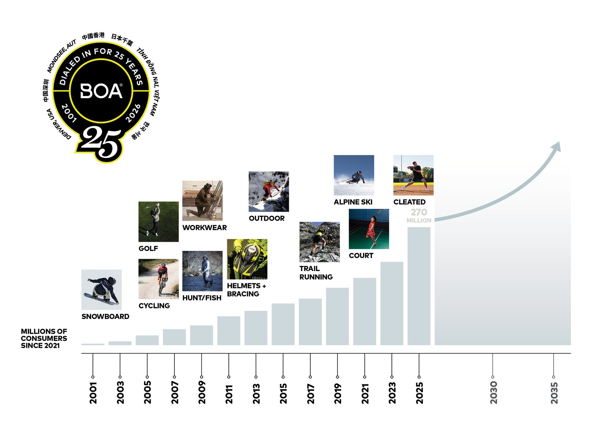 BOA®フィットシステムの開発元であるBOA® Technology社は、今年創立25周年を迎えます。革新、コラボレーション、そしてパフォーマンスを基盤としたこの節目を記念します。その歩みは2001年、創業者ゲイリー・ハマーラグがスノーボードブーツの機能性、フィット感、そしてパフォーマンスのあり方を根本から見直そうとしたことから始まりました。現在、BOA®は従業員約300名を擁するグローバル企業となり、米国コロラド州デンバーに本社を構え、ヨーロッパ、アジア各地にも拠点を置くチームが活躍しています。