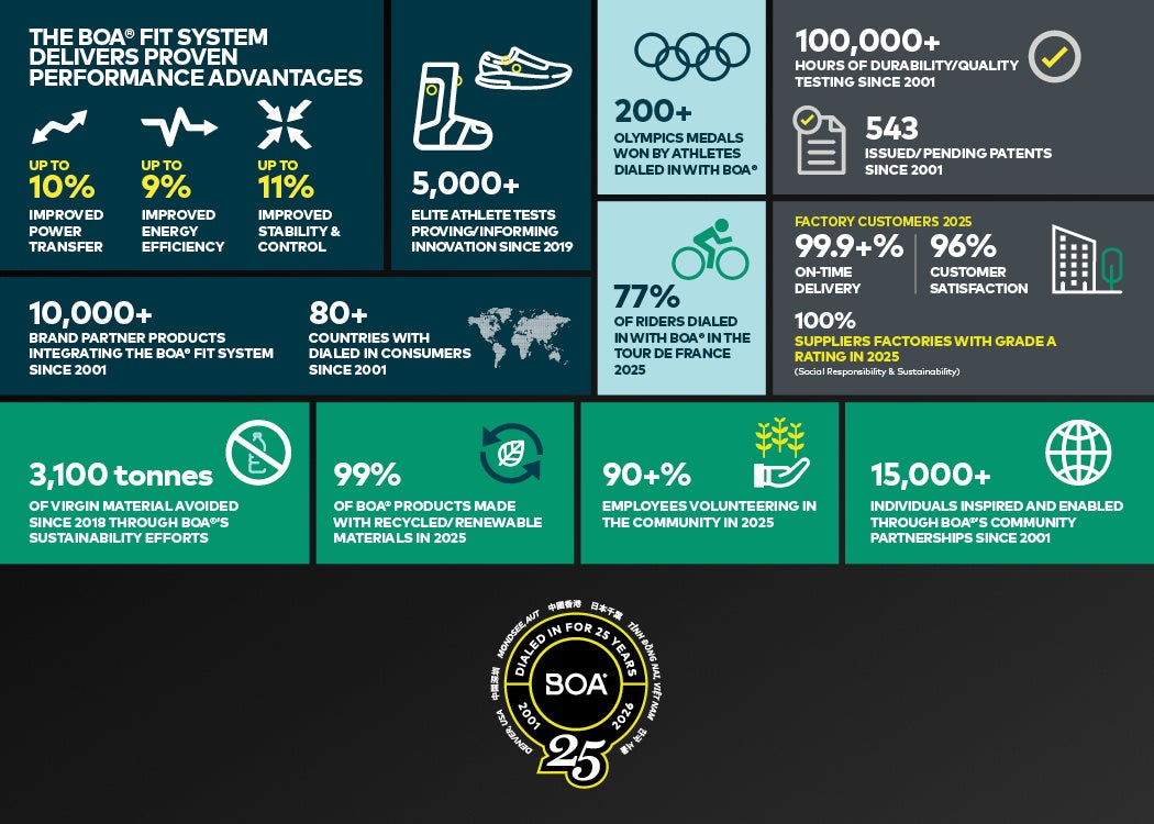 BOA®は、イノベーションへの取り組みと社会的責任への注力において、揺るぎない姿勢を貫いています。543件の特許(取得済みまたは出願中)と10万時間以上に及ぶ耐久性・品質試験に裏打ちされた、性能と耐久性を兼ね備えたソリューションの開発を継続的に推進しています。2025年には、BOA®製品の99%がリサイクル素材または再生可能素材で製造され、2018年以降、3,100トンのバージン素材の使用が削減されました。また、サプライヤー工場の100%が「A」評価を獲得しており、BOA®の社会的責任への取り組みを改めて示しています。2001年以来、BOA®の地域社会とのパートナーシップを通じて15,000人以上が支援を受けており、従業員の90%が毎年地域社会でボランティア活動を行っています。