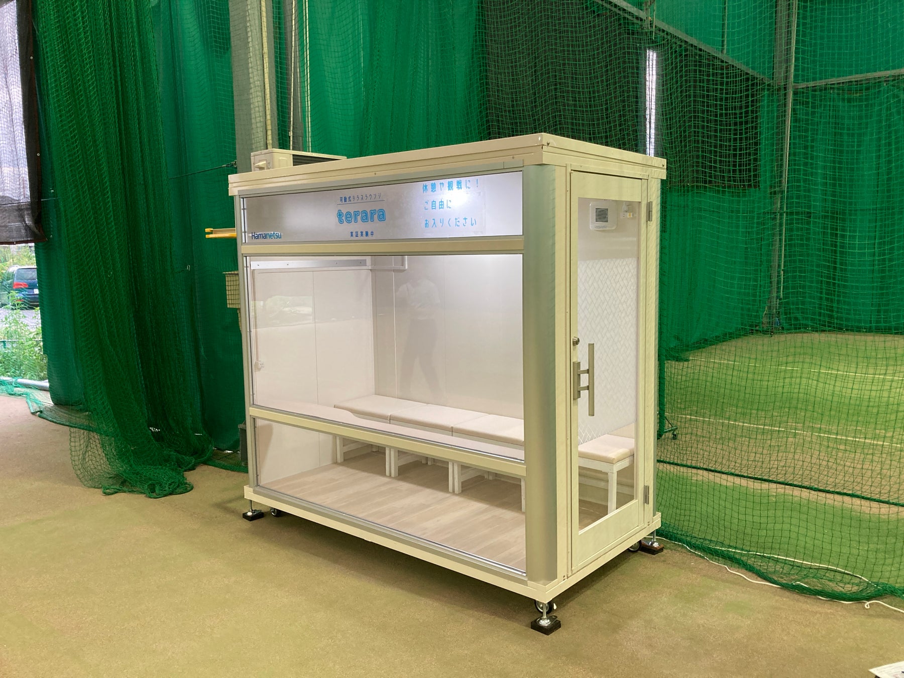 施設側は100Vコンセントを準備するだけ。エアコンが室内を快適な温度まで下げることができ、室内でゆっくりと水分補給もできます。