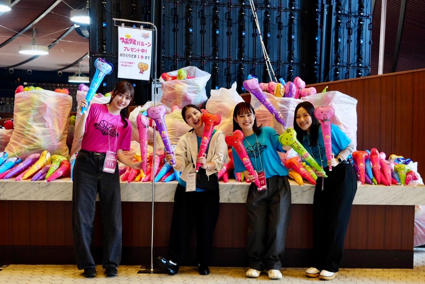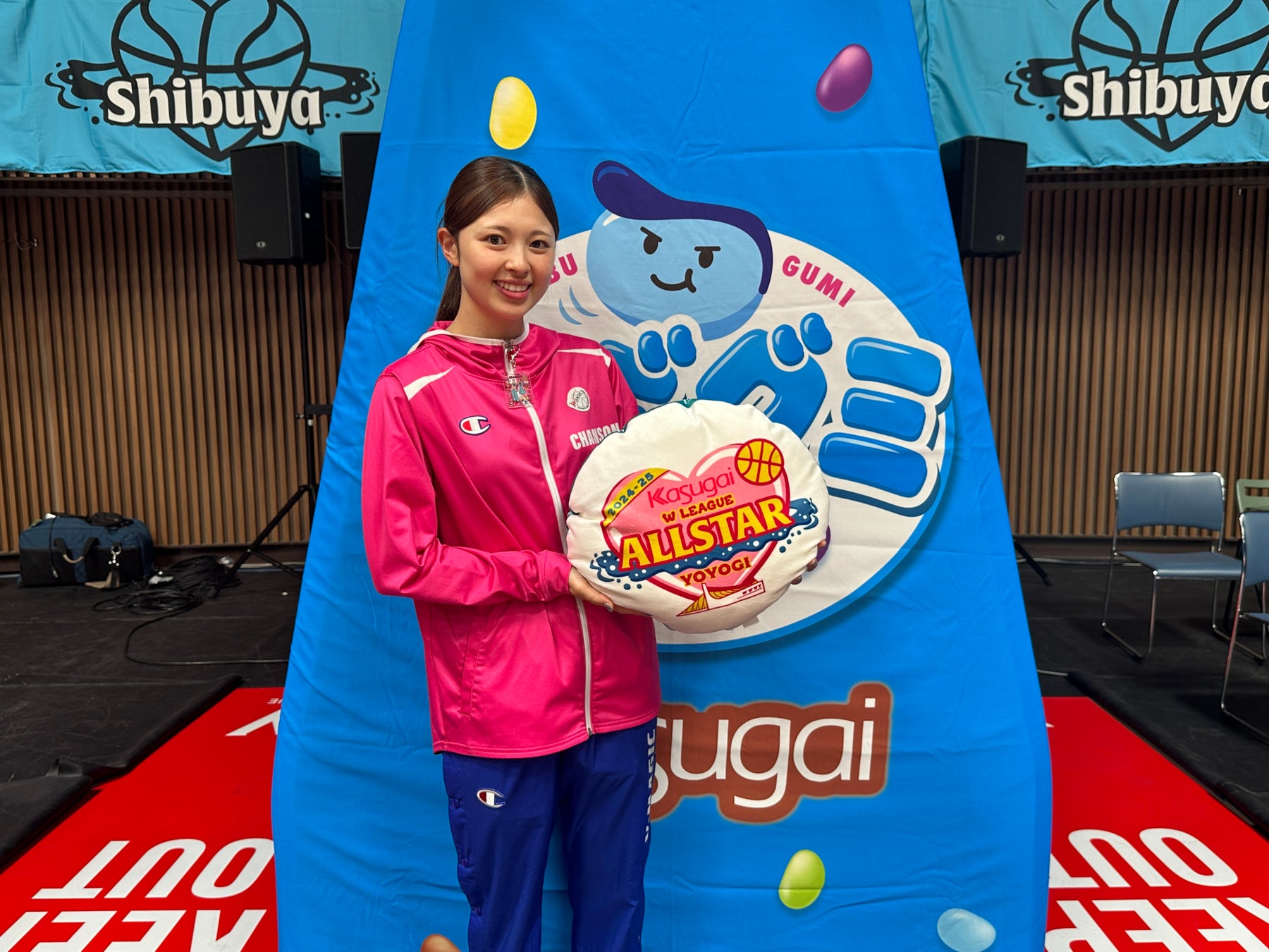▲写真は2024-2025シーズンWリーグオールスター時の様子。今年も来場者には「つぶグミバルーン」をプレゼントします。エントランスでは各チームのゆるキャラ+つぶグミちゃんたちがお出迎え!つぶグme(ミ~)メーカーもぜひお楽しみください。©W LEAGUE