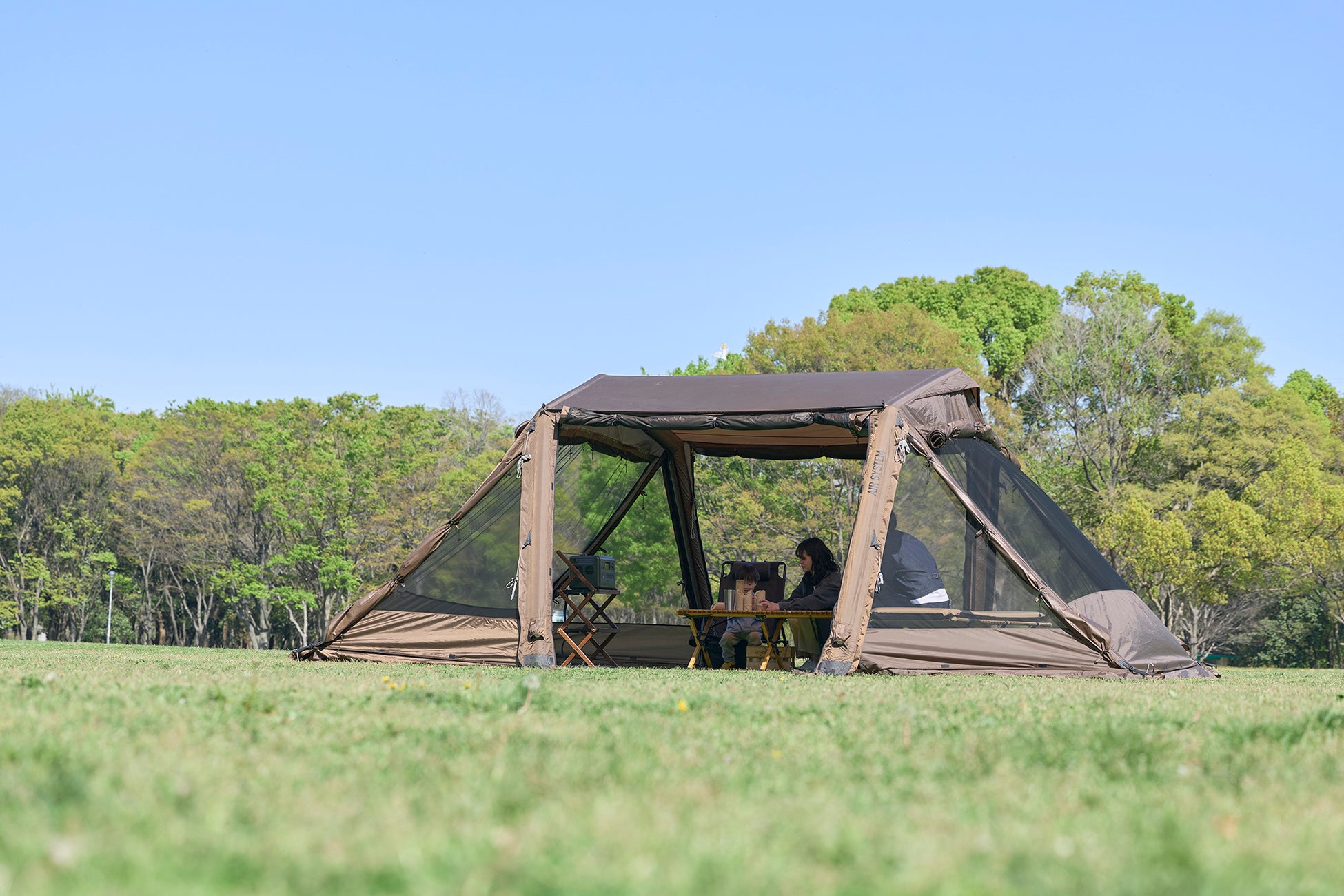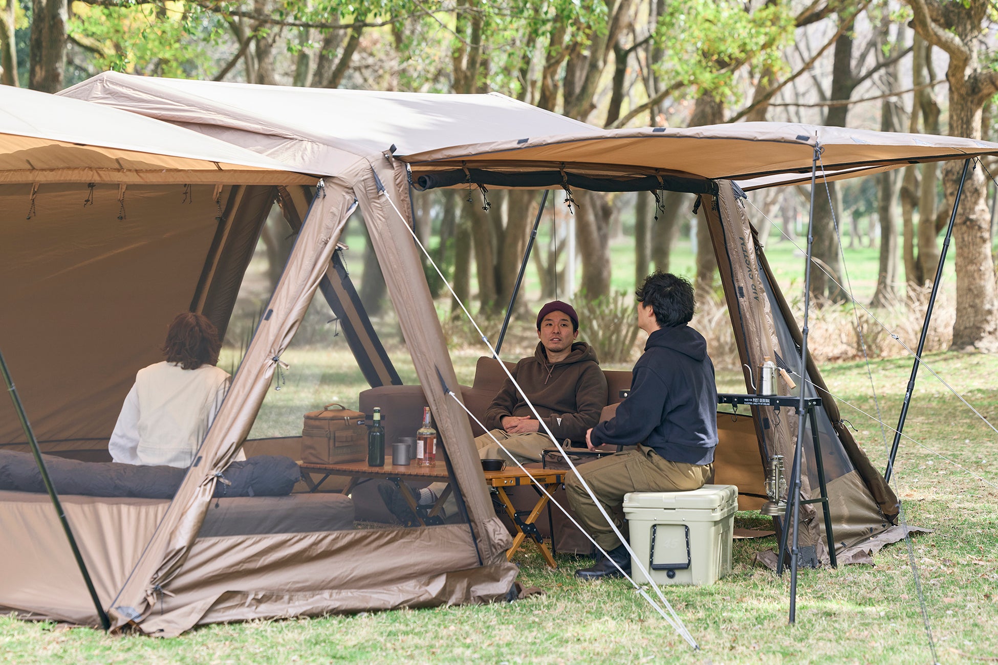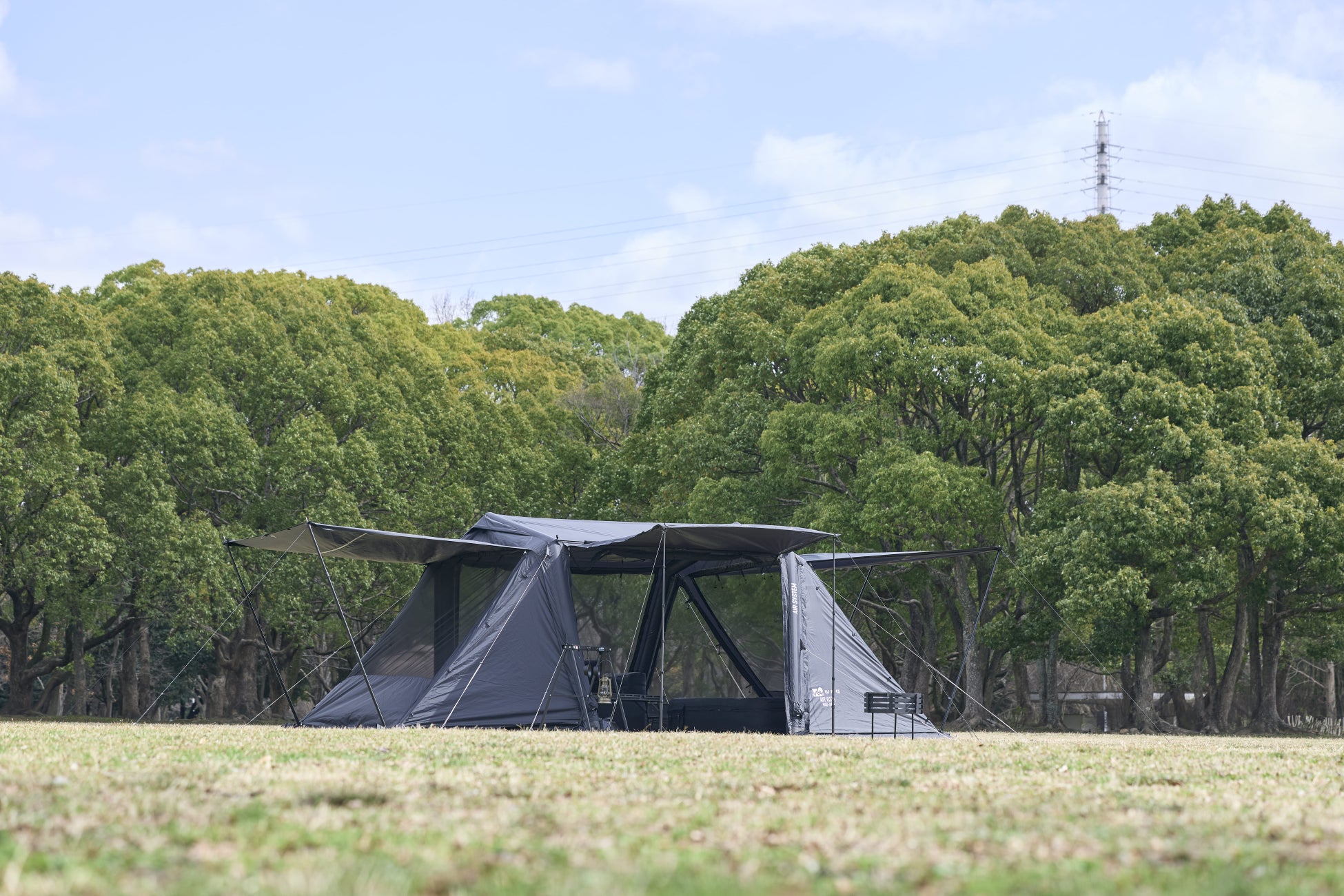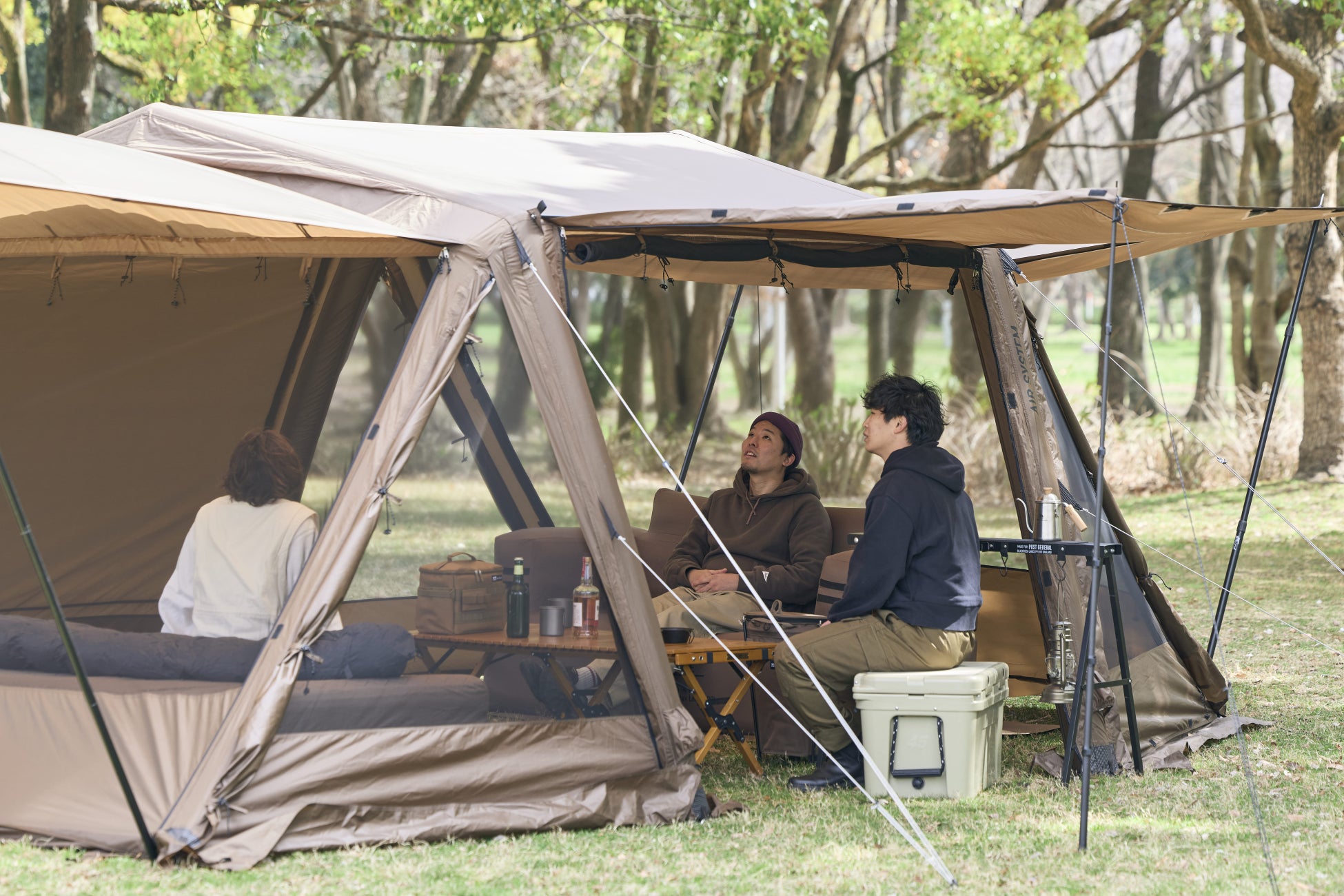 本製品は、大型テントならではの快適な居住性を備えながら、空気を入れて設営できるエアフレーム構造を採用したモデルです。設営時の負担を軽減し、より手軽にキャンプを楽しめるテントとして開発いたしました。快適な居住空間と扱いやすさの両立を目指し、設営や撤収の負担を抑えることで、キャンプ本来の楽しみである“外で過ごす時間”をより豊かにする一張りに仕上げています。