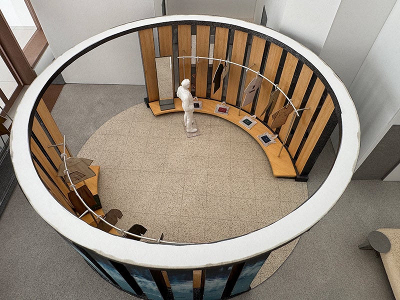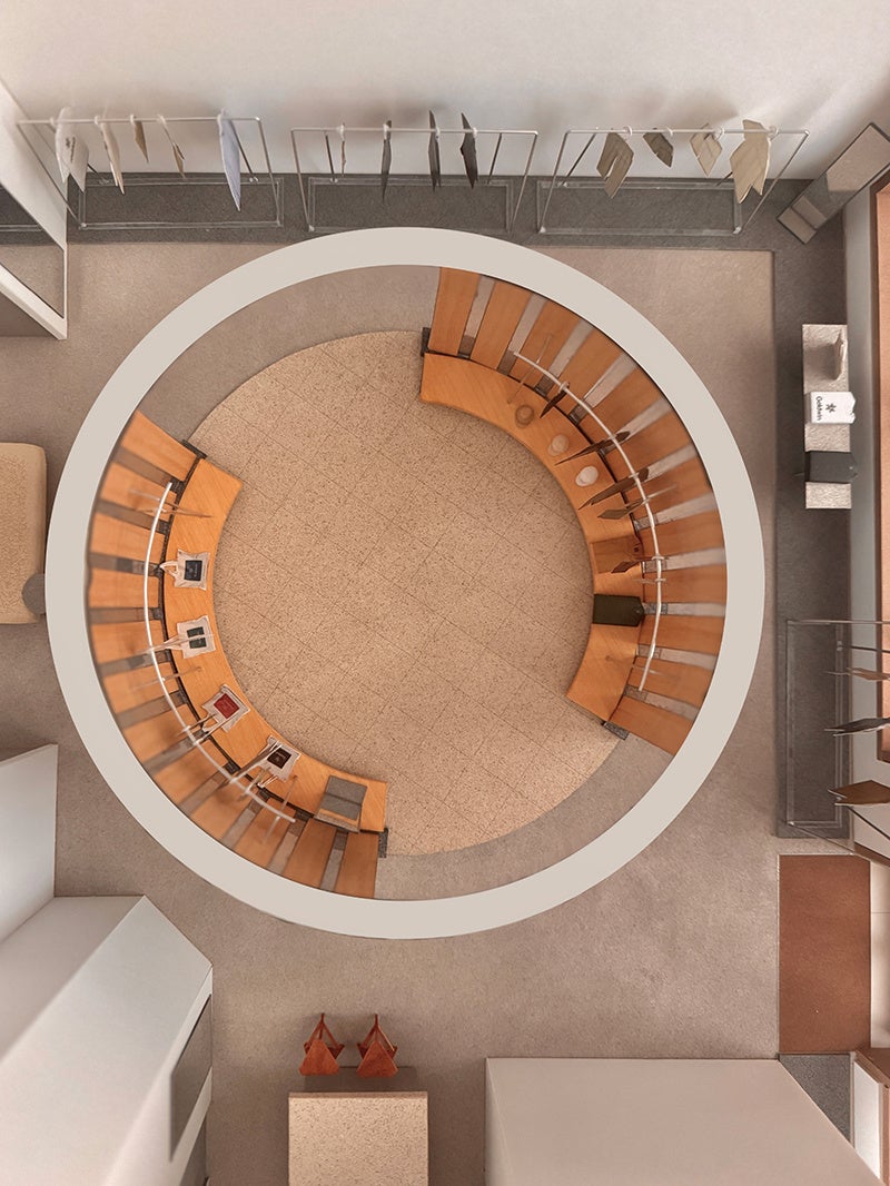 この空間の核となるのは、ガラスのファサードに面して中央に構えた環状の「社(やしろ)」です。ここはGoldwinのスタイルや理念を世界へ発信するステージであり、訪れる人々を物語の中心へと誘います。その外周には、時代を超えて愛されるスタンダードな商品を静かに配置し、空間のすべてが街ゆく人々の目を惹きつける一つの壮大なショーウィンドウとなるよう設計しました。