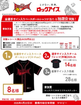 スーパーやコンビニなどで「ロックアイスⓇ」商品を購入した際のレシートの提示、または当日「ロックアイスⓇバルキャンプラウンジ」のご利用で、選手の直筆サイン入りグッズなどが当たる抽選会を開催します。さらに、ロックアイスⓇ公式Instagramアカウントをフォローしていただくと追加で1回抽選が可能となります。。