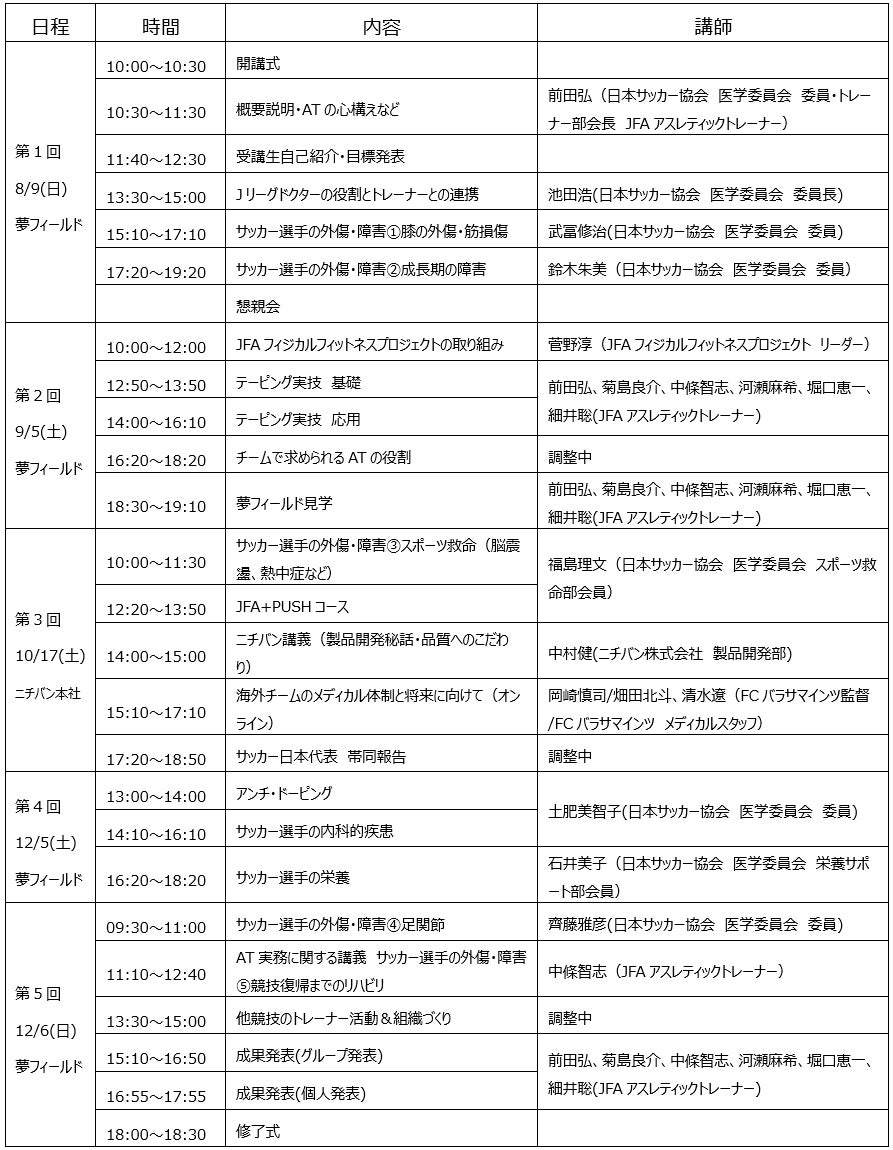 サッカーに関わるアスレティックトレーナーを志す方を対象に、JFAの活動に関わるドクターやアスレティックトレーナーからのセミナー機会を提供し、サッカーの現場における怪我予防、応急処置、コンディショニング等の業務に触れる機会を提供する。