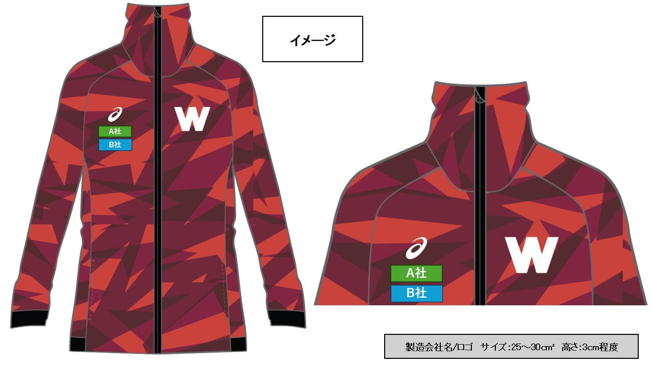 ユニフォーム・アウターウェアへのロゴ掲出に必要な費用(プリント、シール・ワッペンの製作費、接着費等)はスポンサー企業のご負担となります。ウェアメーカーとも協議の上で、最適な形で進めさせていただきます。