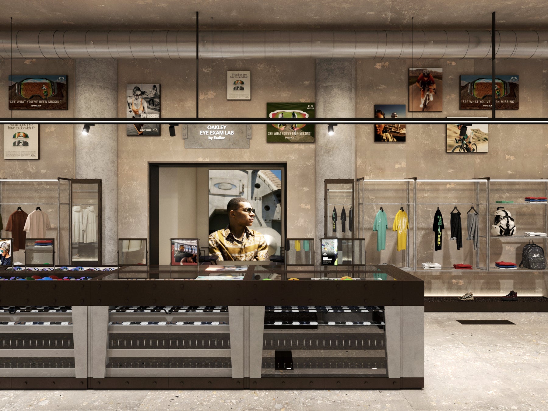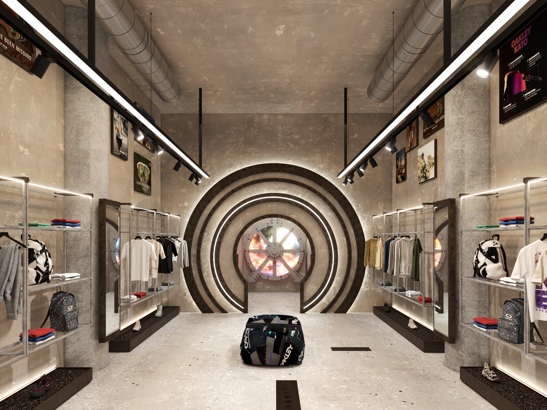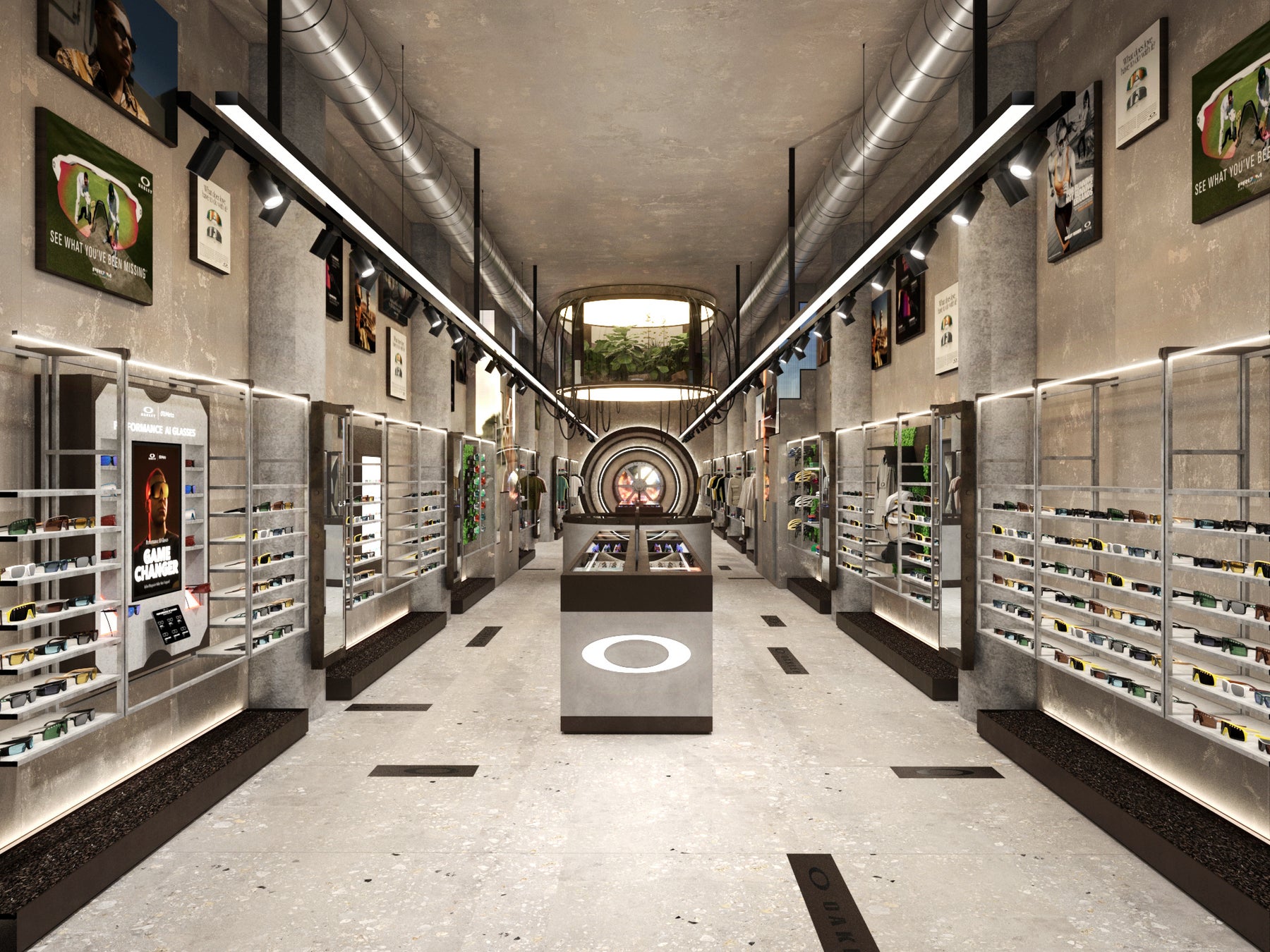 オークリーらしいインダストリアルな空間が広がる店内は、むき出しの機械的な構造や無骨な素材を活かしたブルータリズムの建築様式をベースに設計されています。正面に設置されたオークリー本社のアイコンである大型タービンを模した造形や、吊り下げ式のプラント照明器など、近未来のプロダクトラボを思わせる要素の詰まった空間は、過去から未来へと繋がるブランドの革新性を表現したオークリーのFuture Genesis(フューチャー・ジェネシス)の世界観を投影しています。