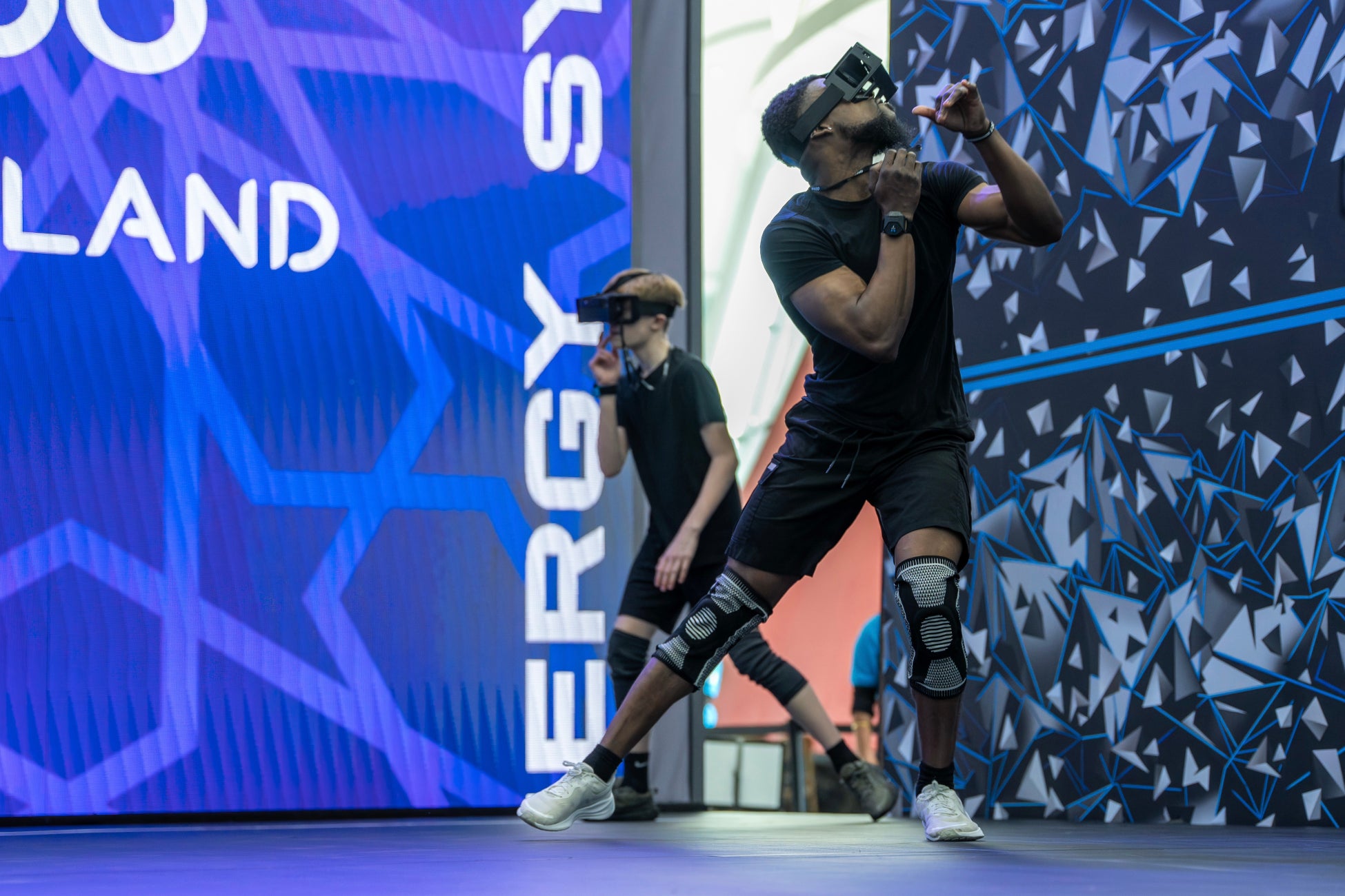 プレイヤーはヘッドセットとアームセンサーを装着し、最大3対3のチーム戦で対戦します。