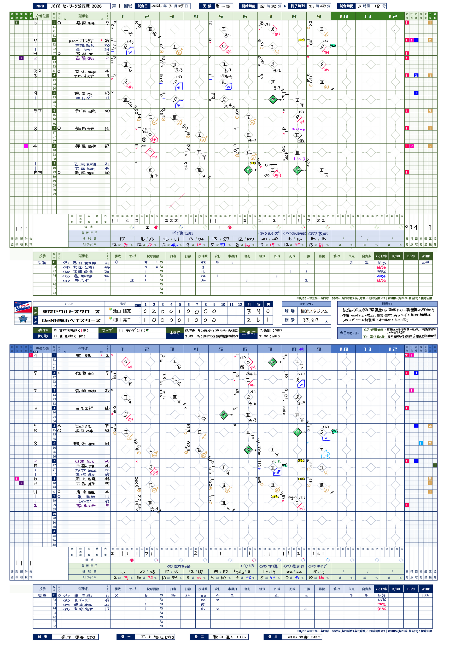また、近年特に重要視されている投手のストライク率やWHIP、K/BB、BB9などセイバーメトリクスに即した記載枠も用意されているため、より高度なアナリティクス分析をスコアで把握できるようになっています。