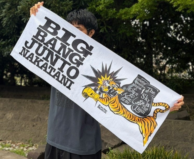 精密機械のように隙のないテクニックを「細部まで計算された緻密な線」で描き、試合を決める爆発力を「力強いタイポグラフィー」で構築。単なる応援グッズの枠を超え、日常使いのファッションアイテムとしても洗練された現代的なグラフィック『BIG BANG JUNTO NAKATANI Tiger』が誕生しました。