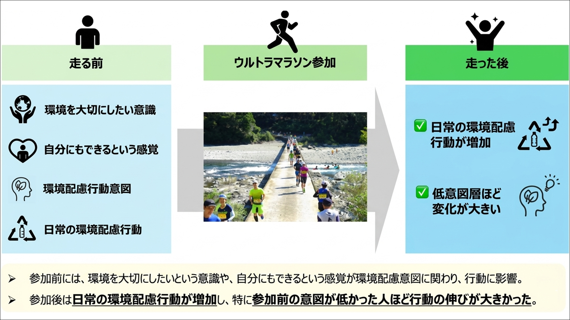 近年、トレイルランニングやウルトラマラソンのような自然の中で実施されるスポーツイベントが、観光や地域振興の観点から注目を集めています。その一方で、こうしたイベントは自然環境に依拠して成立しているため、参加者の環境意識や環境配慮行動を高める契機となりうるのかが重要な研究課題となっていました。しかし、従来研究の多くは単一時点の調査にとどまっており、イベント参加が実際の行動変化にまでつながるかについては、十分に検証されていませんでした。