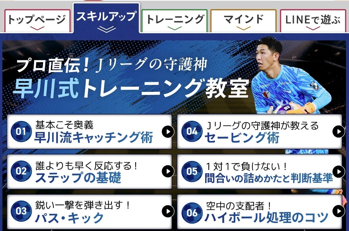【スキルアップ】:早川流キャッチング術をはじめ、ステップの基礎・パスキック・セービング術・間合いの詰め方・ハイボール処理など、GKに特化した技術解説動画を段階別(ビギナー/プロフェッショナル)に配信。早川選手本人が出演・解説する完全オリジナルコンテンツです。