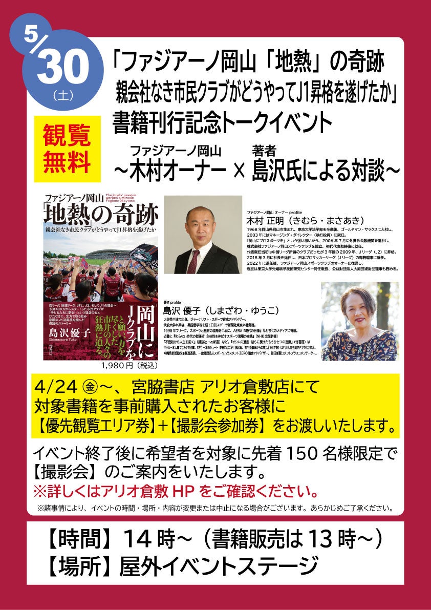 株式会社竹書房(所在地:東京都千代⽥区、代表取締役社⻑:宮⽥ 純孝)は、『ファジアーノ岡山「地熱」の奇跡 親会社なき市民クラブがどうやってJ1昇格を遂げたか』(著者:島沢優子(しまざわ・ゆうこ))を2026年4月24日(金)に発売いたします。
