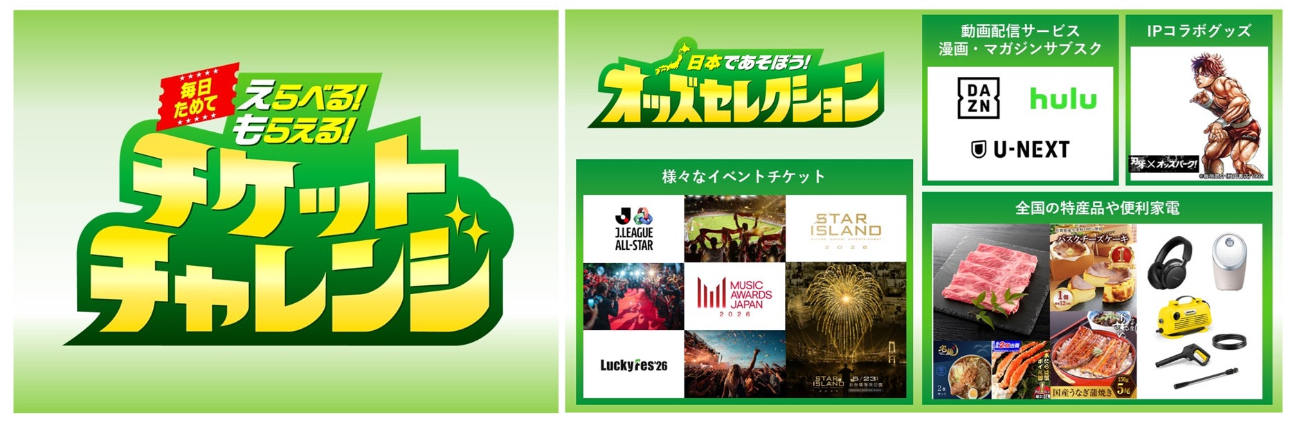 2026年4月23日(木)より、新キャンペーン「毎日ためて えらべる!もらえる!チケットチャレンジ」を開始しました。キャンペーンページからエントリーのうえ、条件を達成すると、抽選でチケットを獲得できます。獲得したチケットは賞品ラインナップページ「日本であそぼう!オッズセレクション」にて、枚数に応じて好きな賞品と交換できます。賞品は食品や家電、スポーツ観戦や音楽イベント等の招待券、サブスク特典など、多彩なラインナップを用意しています。ぜひ本キャンペーンにご参加ください。