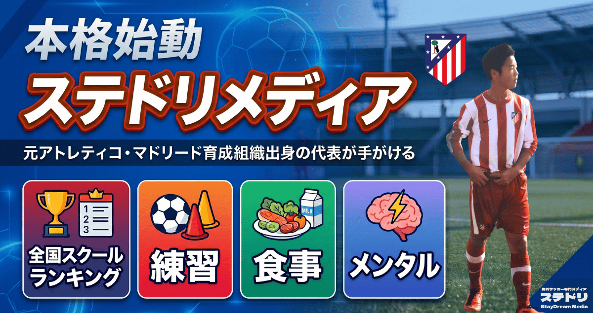 10歳で渡西しアトレティコ育成組織で6年間プレーした経験と、13名のプロ契約輩出実績を持つStayDream Group代表・宮川類が監修。都道府県別スクールランキング+育成コラム30本以上を無料公開