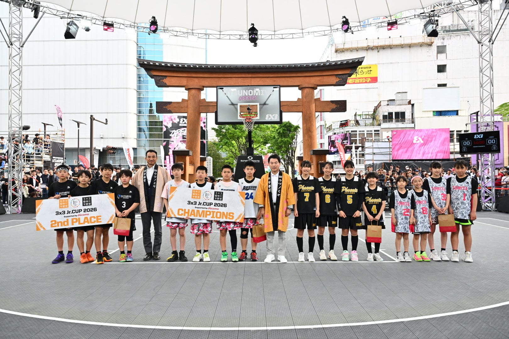 4月25日(土)・26日(日)には、U-12世代を対象とした「3×3 Jr.CUP」を開催いたしました。今大会からチーム数を拡大し、39チーム(男子21、女子18)が出場。「宮みらいライトヒル交流広場」「ライトキューブ宇都宮」で行われた予選、順位決定戦を経て勝ち残ったチームによる決勝は、FIBA 3×3 World Tour Utsunomiya Openerの会場である二荒山神社に場所を移して開催。世界中のトップアスリートだけが踏み入れることができるこの二荒山神社の本コートに、子どもたちがプレーできる機会を創出しました。