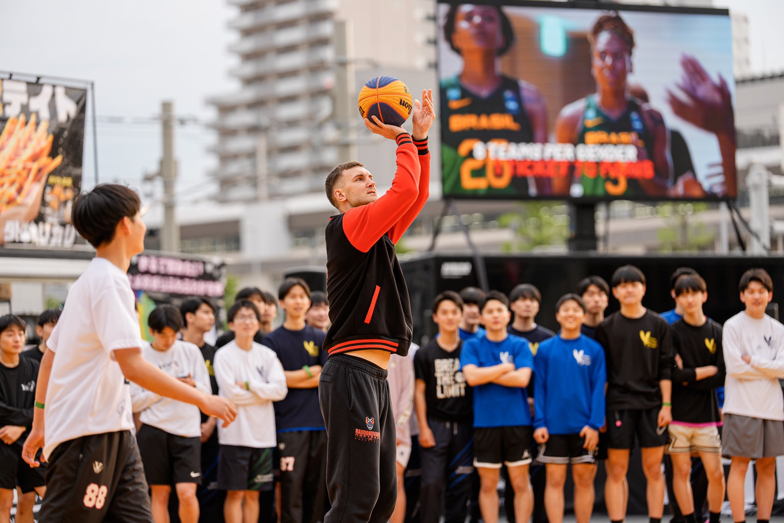 大会前日の4月24日(金) 、宇都宮市のシンボルカラーであるイエローにアレンジされたコート上で、「3×3 FAN FEST」を開催いたしました。翌4月25日(土)のFIBA 3×3 World Tour Utsunomiya Opener 2026に出場する5チームが子どもたちと交流しました。
