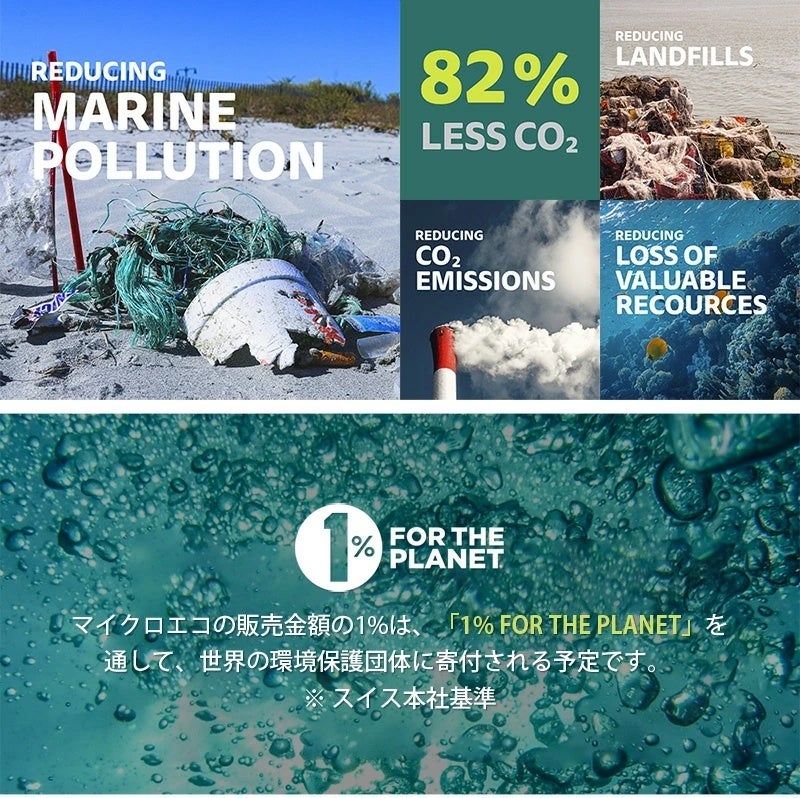 同社はこうした課題に対応するため、海洋から回収されたペットボトルや廃棄ネットなどをリサイクルした素材を活用し製品を開発。ECOラインは資源循環による環境負荷低減に加え、製造工程において最大82%のCO₂排出削減を実現している点が特長である。また、スイス本社の基準に基づき、「1% for the Planet」を通じて、ECO製品の売上金額の1%を世界各国の環境保護団体へ寄付している。