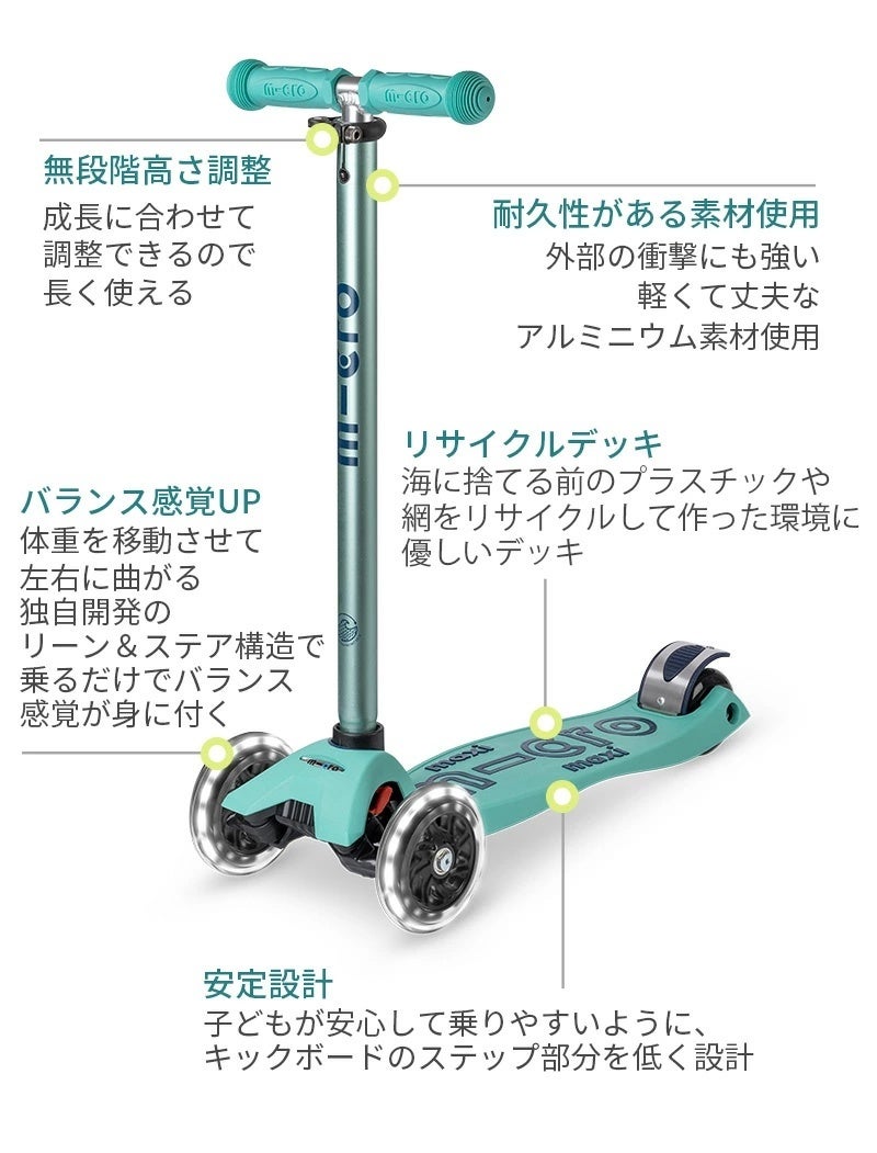 「マキシ エコ マイクロ デラックス LED」は、5歳以上の子どもを対象とした三輪キックスクーターで、体重移動によって方向転換を行う「リーン&ステア構造」(特許取得)を採用。走行時に自動発光するLEDホイールを搭載し、安全性と楽しさを両立している。製品重量は約2.75kg、耐荷重は50kg。
