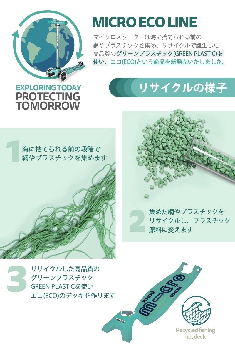 マイクロスクーターは、環境問題への関心が高まる中、海洋廃棄物問題の解決に貢献するため、環境配慮型製品の「ECOライン」を展開している。 現在、年間約800万トンのプラスチックや廃棄された漁網が排出されており、そのうち約11%が海洋へ流出している。この量は地球を約425周する規模に相当する。