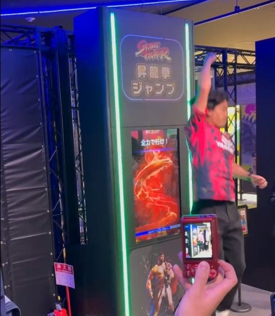 リュウやケンになりきって、おなじみの必殺技「昇龍拳」にチャレンジ!どこまで高くジャンプできるかを測ります。