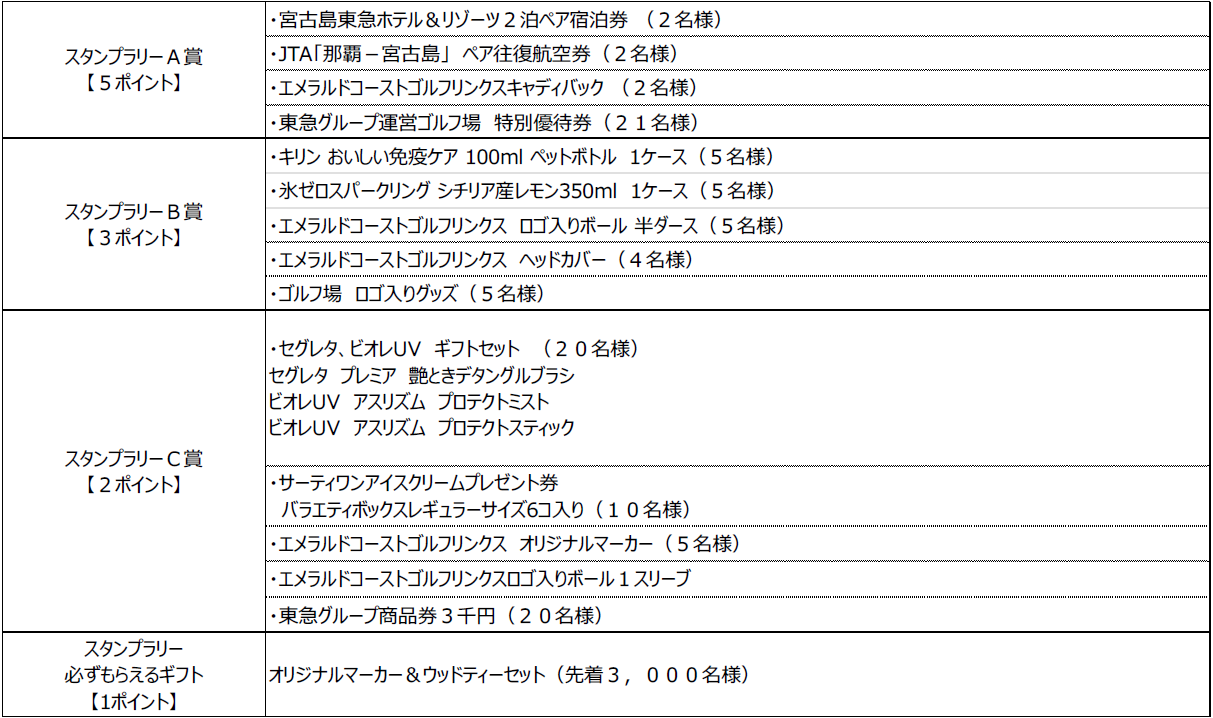 また、本イベント期間中は、スマートフォンを利用したスタンプラリー(※2)を同時開催。1ラウンドごとにスタンプを獲得でき、スタンプ数に応じて豪華賞品が当たる抽選に応募できます。さらに今年は、先着3,000名様に「1ポイントで必ずもらえるオリジナルギフト」をご用意。宮古島東急ホテル&リゾーツのペア宿泊券をはじめ、エメラルドコーストゴルフリンクスのキャディバッグやプレー券など、多彩な賞品も取り揃えています。特別会場の参加者も、参加賞の進呈およびスタンプラリーの対象となります。