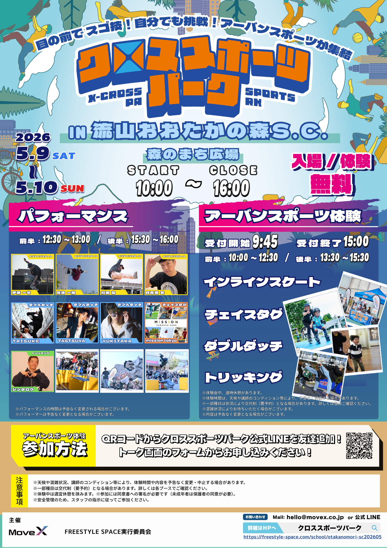 株式会社MoveX(本社:東京都品川区)は、体験型アーバンスポーツイベント『クロススポーツパーク』を、2026年5月9日(土)・10日(日)に流山おおたかの森S.C.にて開催いたします。昨年12月の大盛況を受けての第2回開催となる今回は、人気のインラインスケートエリアを拡張、開催時間も前回(10:00〜15:00)より1時間延長し10:00〜16:00に。さらに充実した内容でお届けします。