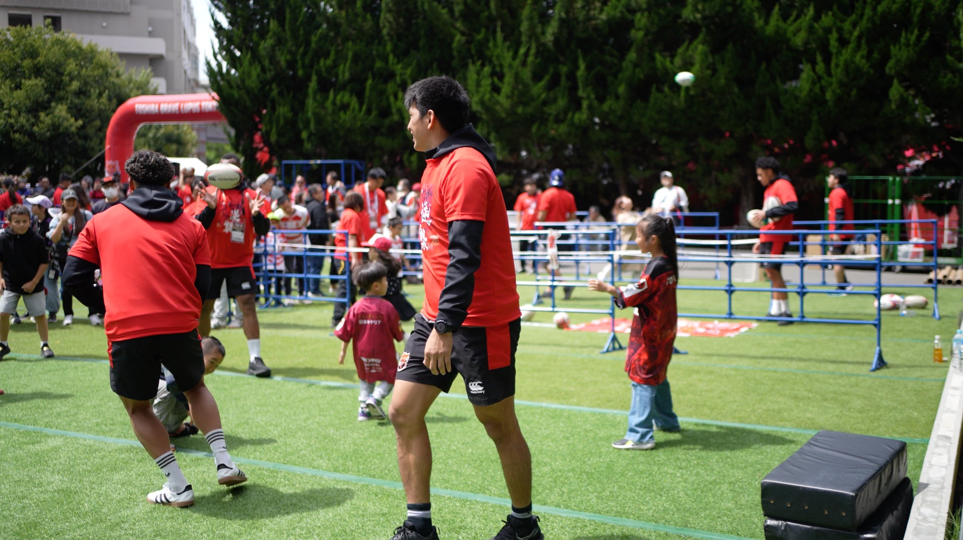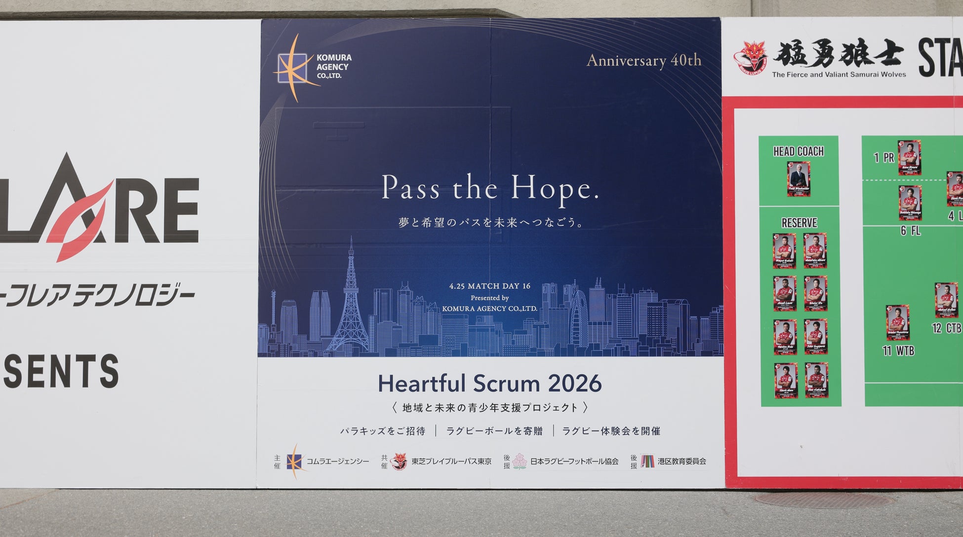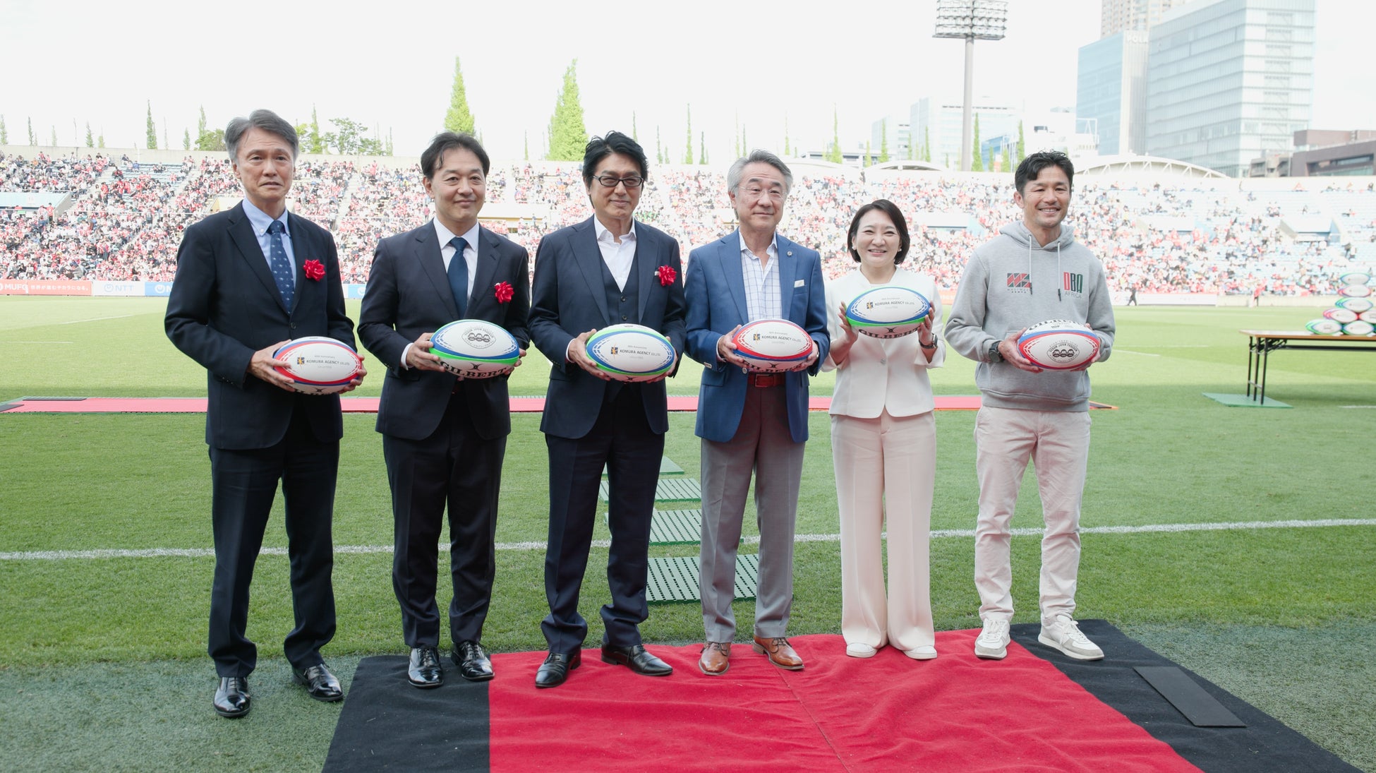 株式会社コムラエージェンシー(本社:東京都港区三田、代表取締役:小村 峰之)は、2026年4月25日(土)に、創業40周年記念事業として青少年支援プロジェクト「ハートフル・スクラム2026」を開催いたしました。当日は天候にも恵まれ、多くの観衆の下、式典およびラグビー体験会が盛大に行われました。港区の幼稚園・保育園・小学校148ヵ所へのラグビーボールの寄贈をはじめ、パラキッズの試合観戦やプロ選手とのラグビー体験会を通じ、スポーツの力で次世代へエールを送る充実した一日となりました。
