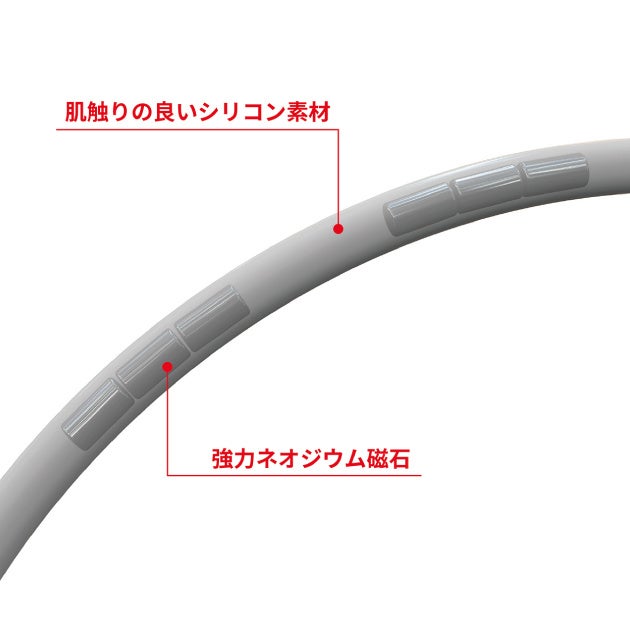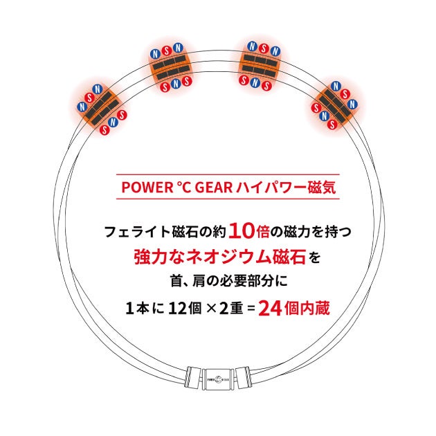 磁束密度160 mT のネオジウム磁石を1本に12 個 ( 2本で24個 ) 内蔵。2重ループ構造によって誕生した、他にはない次世代の磁気疲労回復ネックレス。